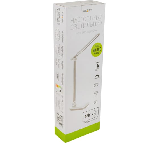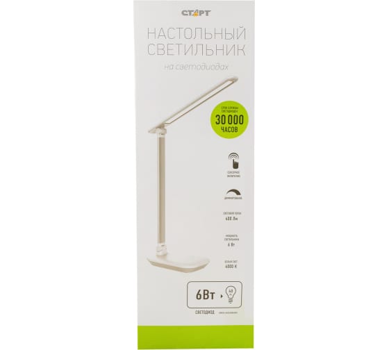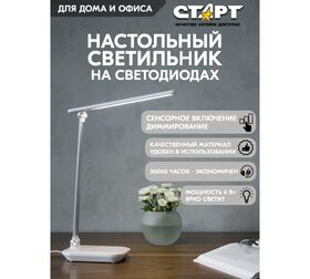 Модель СТАРТ СТ111 имеет 3 уровня яркости, для переключения светильник оснащен диммером. Сенсорный переключатель яркости находится на подставке. Светильник работает от сети со стандартным напряжением 220 В, подключается с помощью вилки и шнура.