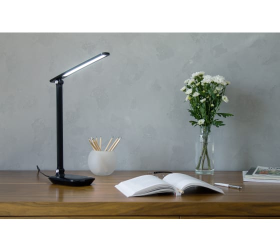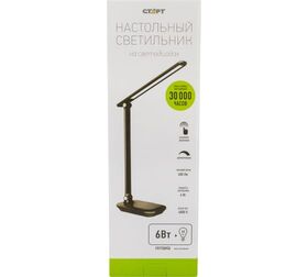 Светильник универсальный на светодиодах СТАРТ СТ111 подходит для дома и офиса, а также для гаража. Это классическая настольная лампа с вытянутым плафоном на прямой стойке с устойчивым плоским основанием. Корпус черного цвета из металла и пластика. Плафон можно поднимать и опускать под нужным углом.