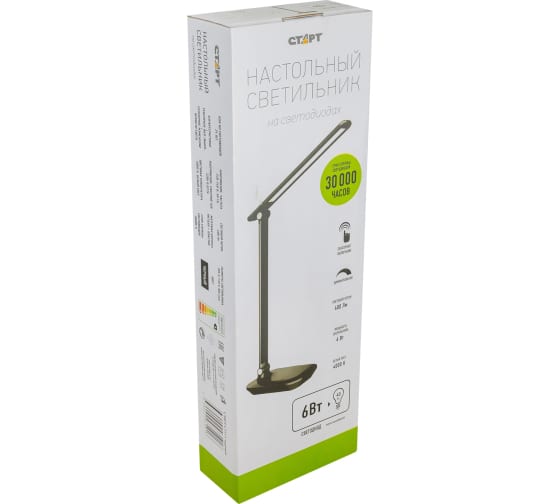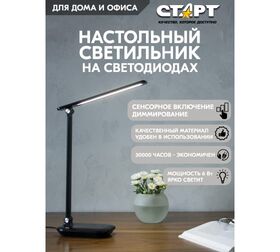 Светильник СТАРТ СТ111 оснащен диммером для переключения уровней яркости. Можно выбрать один из трех уровней, воспользовавшись сенсорным переключателем на подставке. Светильник подключается к стандартной домашней сети 220 В при помощи шнура и вилки. Его можно расположить на рабочем столе дома или в офисе, на полке, в гараже. Отрегулировать уровень света можно, наклоняя плафон. Плоская подставка может служить для хранения мелких предметов.