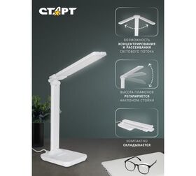 Светодиодный светильник СТАРТ СТ90 — универсальный, подходит для дома и офиса, как источник дополнительного точечного света в помещении. Он представляет собой плоские вытянутые два плафона на прямой стойке и плоском основании. Плафоны могут подниматься, опускаться и менять свое положение по горизонтали. Стойка так же может подниматься и опускаться, меняю при этом угол наклона. Корпус белого цвета выполнен из пластика и металла.