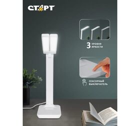 Модель СТАРТ СТ90 имеет 3 уровня яркости. Сенсорный переключатель яркости находится на подставке. Светильник работает от сети со стандартным напряжением 220 В, подключается с помощью вилки и шнура.