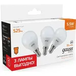 Лампа светодиодная Gauss Basic 10531152T 5.5Вт цок.E14 шар 220B 3000K св.свечения белый теплый уп/3шт