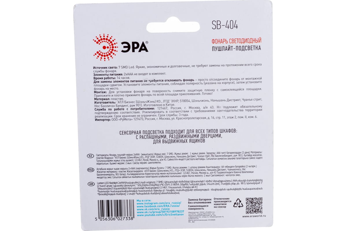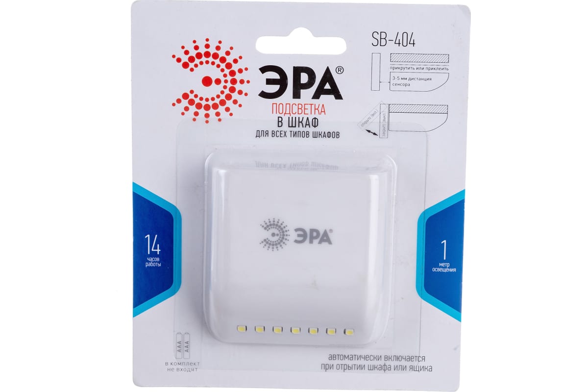 Светодиодный фонарь подсветка ЭРА SB404 в шкаф сенсорный на батарейках 7SMD LED Б0042658 - это светодиодный фонарь-подсветка, который сделает быт более комфортным. Быстро и просто устанавливается в кухонные, платяные или гардеробные шкафы. Крепится на самоклеящиеся липучки или болты, поставляемые в комплекте.
