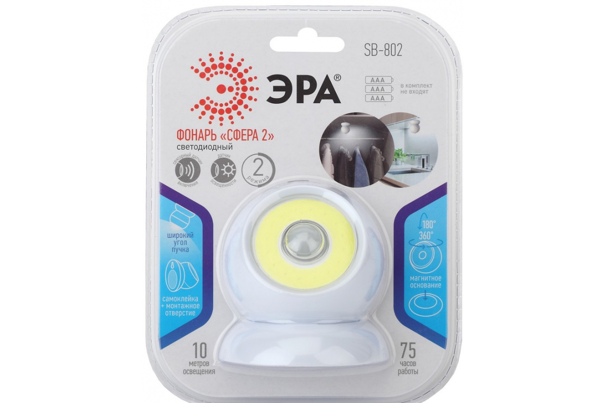 Фонарь-пушлайт ЭРА SB-802 Сфера-2 5Вт, COB, 3xAAA, датчик движения, магнит, блистер Б0036608 - компактный светодиодный фонарь на магнитном основании.