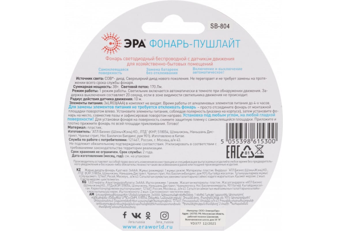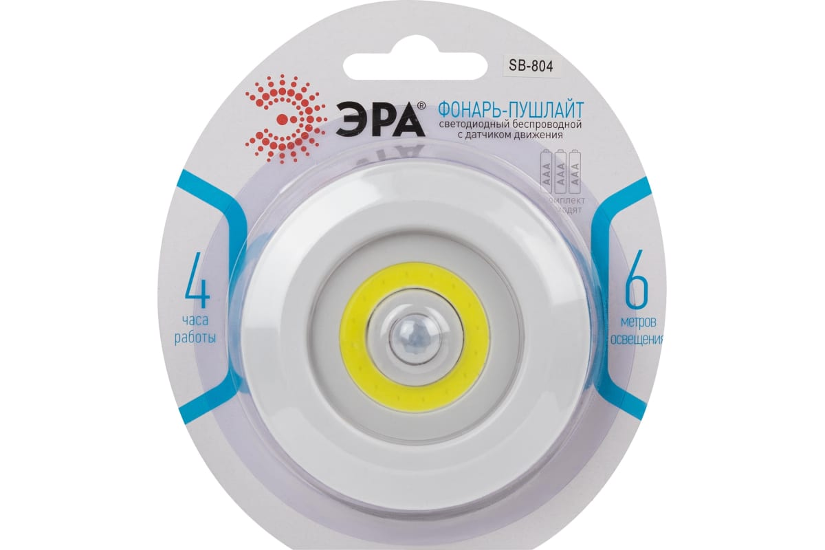 ЭРА SB-804 - светодиодный беспроводной фонарь с датчиком движения. Удобная подсветка с автоматическим включением и выключением. Эргономичный бытовой фонарик работает от мизинчиковых батареек (3 х ААА). Надежно фиксируется в любом месте и под любым углом благодаря самоклеящейся монтажной площадке. Монтируется за минуту! Для смены батареек фонарь не нужно отклеивать: легкий доступ к отсеку с элементами питания можно получить, сняв со специальных креплений верхний блок корпуса. От одного комплекта алкалиновых элементов питания данный бытовой фонарь непрерывно работает 4 часа.