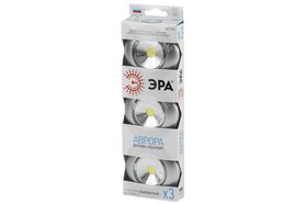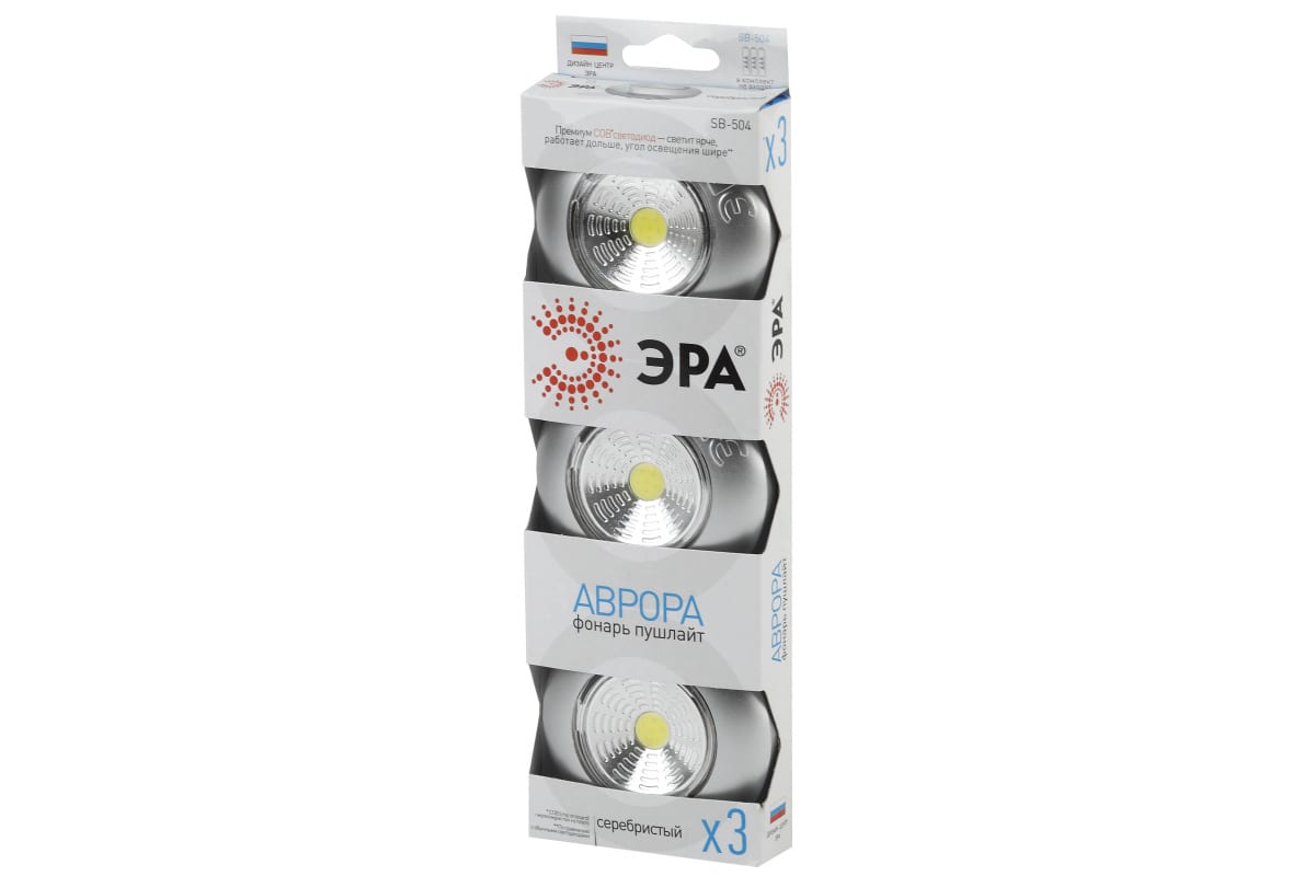 Фонарь ЭРА SB-504 NEW пушлайт Аврора COB, 3xAAA, серебристый, 3шт Б0031043 - удобный инструмент для аварийного или интерьерного освещения. Фонарь светит ярким белым светом, оснащён 4 светодиодами последнего поколения. Такие светодиоды не тускнеют со временем и не требуют замены. Экологичный ударопрочный пластик выполнен в спокойных классических цветах, которые впишутся в любой интерьер.