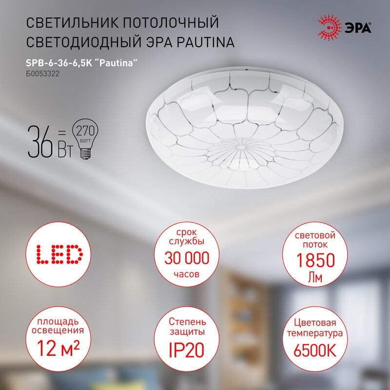 Потолочный светодиодный светильник ЭРА SPB-6-36-6,5K Pautina 36Вт 6500K 1850Лм, Б0053322 гармонично впишется в любое дизайнерское решение. Главным преимуществом LED светильника является наличие алюминиевого основания. Оно обеспечивает хороший теплоотвод, что увеличивает срок эксплуатации. Неповторимый минималистичный корпус плафона освежит интерьер спальни, прихожей или гостиной. Слегка выпуклая форма придает модели динамику. Срок службы 30 000 часов подарят беспрерывное и долгое использование светодиодной люстры.