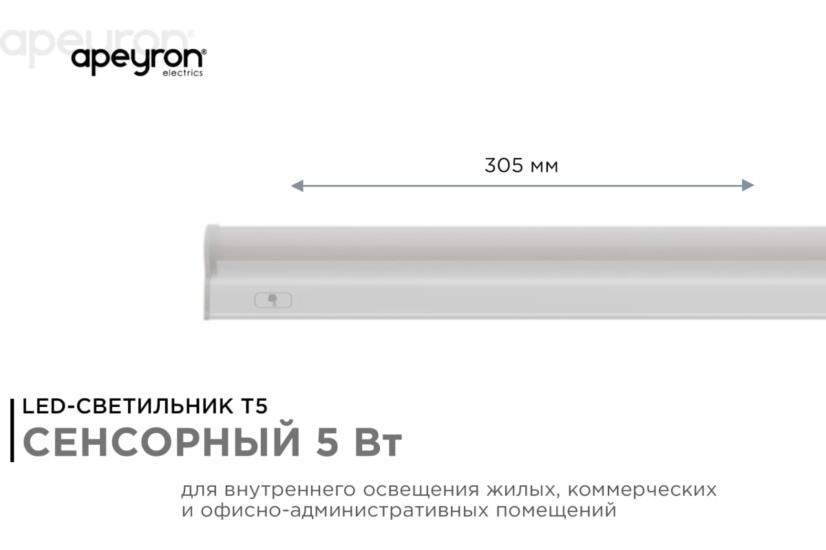 Сенсорный светодиодный светильник Т5 30-02 управляется одним касанием благодаря сенсорному выключателю. Излучает световой поток в 420 Лм, потребляя при этом 4 Вт, что является эквивалентом лампы накаливания 40 Вт. В светильнике используются светодиоды с холодным белым цветом свечения и цветовой температурой 6500 К. Такой цвет свечения хорошо использовать в тех местах, где требуется создать атмосферу, улучшающую концентрацию. Корпус и рассеиватель светильника сохранят свой первозданный вид и светорассеивающие качества на протяжении всего срока эксплуатации благодаря тому, что изготовлены из поликарбоната, который устойчив к воздействию температур и солнечного света. Размер светильника 305х23х35мм. Степень защиты светильника от пыли и влаги соответствует стандарту IP20, что подразумевает эксплуатацию в сухих, проветриваемых помещениях. В комплекте: сетевой шнур длиной 950 мм, коннектор для гибкого соединения длиной 150 мм и коннектор для жесткого соединения светильников, торцевая заглушка, крепежные элементы для фиксации в накладном варианте. Количество светильников, которые можно соединить последовательно, 14 шт. Благодаря надежному драйверу светодиоды защищены от скачков напряжения, а сам светильник сохраняет равномерное свечение. Работает от сети с напряжением 230 В.