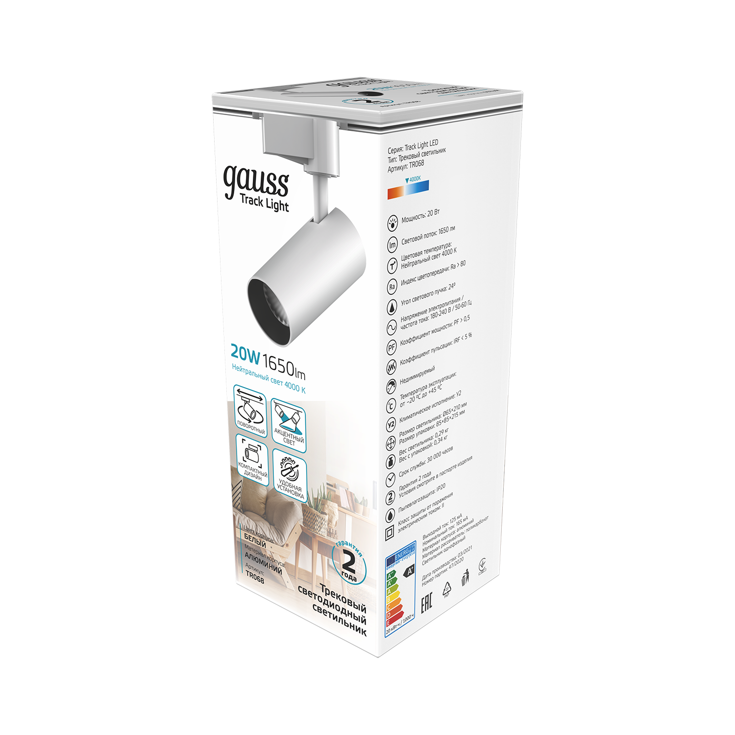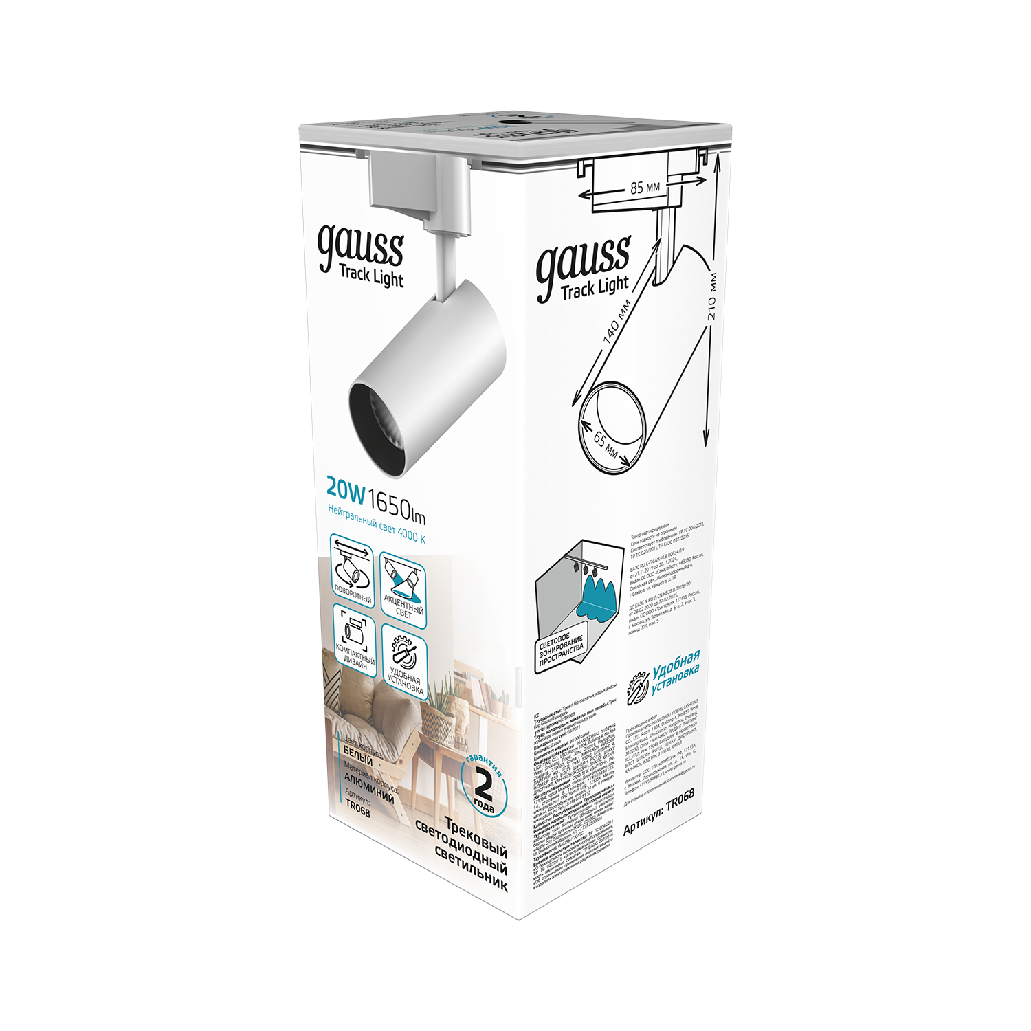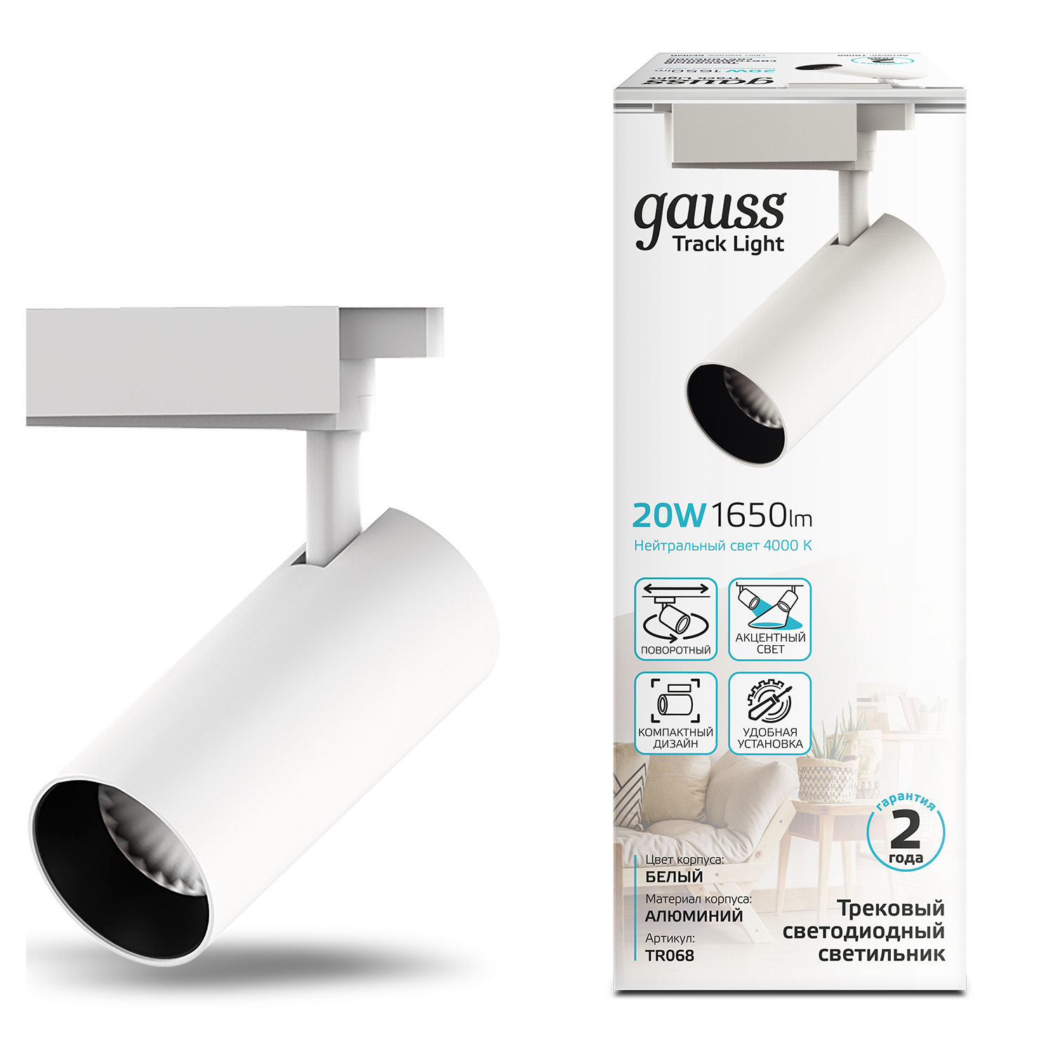 Светильник трековый Gauss цилиндр 20W TR068 предназначен для светового зонирования пространства, имеет внушительные характеристики при компактных размерах: световой поток 1650лм при угле рассеивания 24°. Цветовой диапазон 4000К представляет собой белый нейтральный свет, не влияющий на цветовосприятие человека. Спот прекрасно смотрится в спальне, кабинете, гостинной, гардеробной, прихожей. Отлично подчеркивает мебель, витрины, картины, декоративную отделку стен и прочие элементы требующие дополнительного светового акцента. Является элементом трекинговых систем Gauss.