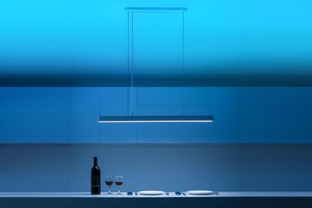 Длина светильника 90 см и регулируемая подвесная конструкция на тросах делают данный гаджет прекрасным выбором для кухни или холла.