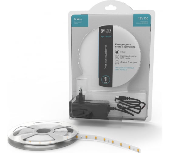 Технические характеристики Gauss Basic в комплекте 12V 6W/m 600lm/m 4000 IP65 LED 5m BT014