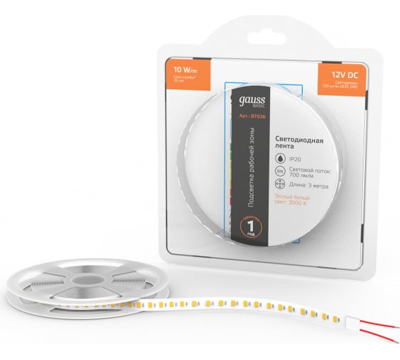 Технические характеристики Gauss Basic 12V 10W/m 700lm/m 3000K IP20 LED 3m BT036
