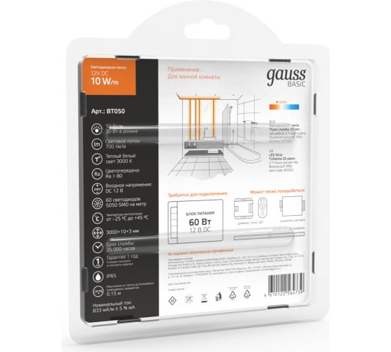 Технические характеристики Gauss Basic 12V 10W/m 700lm/m 3000K IP65 LED 3m BT050