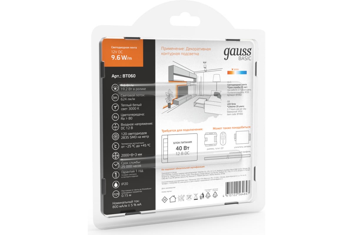Лента Gauss Basic 12V 9,6W/m 624lm/m 3000K IP20 LED 2m BT060 способна решить ряд задач связанных как с декоративным освещением помещений, так и с экстерьерной подсветкой.