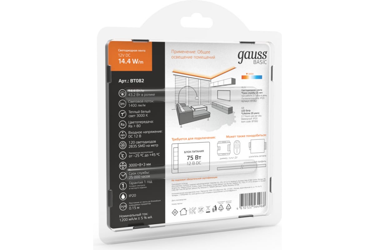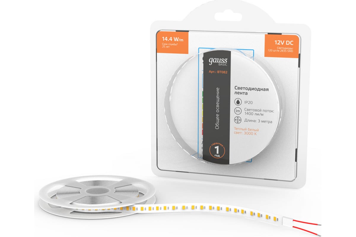 Лента Gauss Basic 12V 14,4W/m 1400lm/m 3000K IP20 LED 3m BT082 способна решить ряд задач связанных как с декоративным освещением помещений, так и с экстерьерной подсветкой.