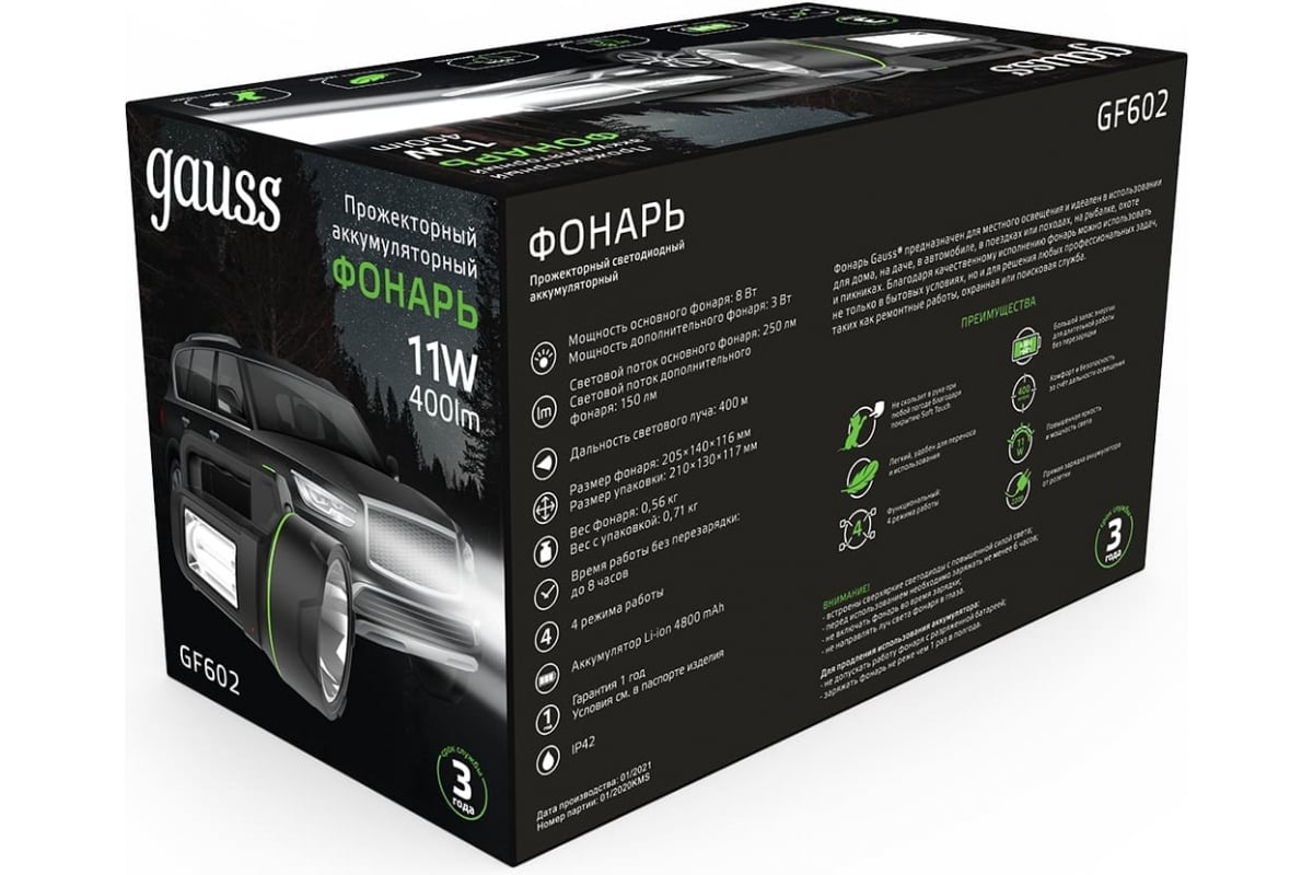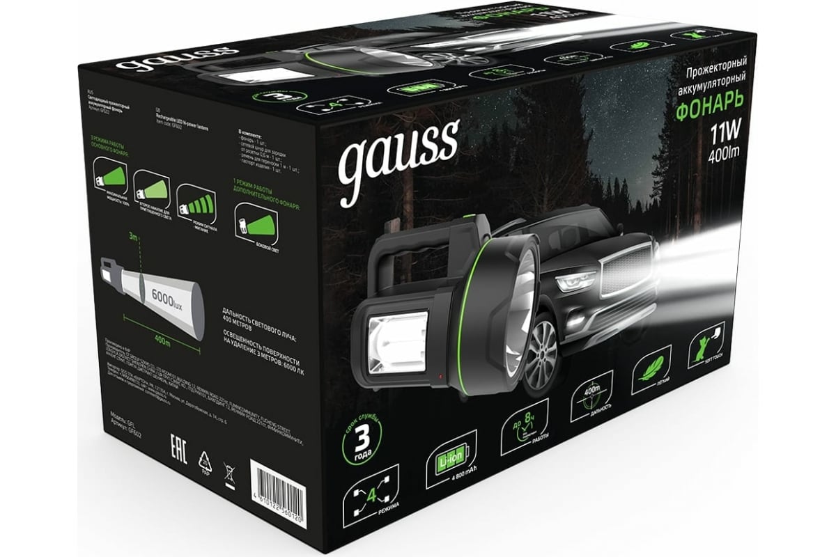 Прожекторный фонарь Gauss Gauss модель GFL602 11W 400lm Li-ion 4800mAh LED 1/10/30 GF602 – мощный, легкий, универсальный и необходимый помощник в быту и не только, который должен быть в арсенале у каждого. Особенностью прожекторного фонаря является высокая яркость и мощность света. Дальность луча от самого мощного фонаря составляет 500 метров. Фонарь обладает современным дизайном корпуса и покрытием «Soft touch» - без эффекта скольжения в руках и приятным тактильным ощущением.