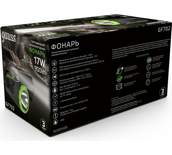 Технические характеристики Gauss GFL702 17W 900lm Li-ion 10000mAh диммируемый LED GF702