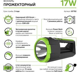Прожекторный фонарь Gauss модель GFL702 17W 900lm Li-ion 10000mAh диммируемый LED 1/12 GF702 – мощный, легкий, универсальный и необходимый помощник в быту и не только, который должен быть в арсенале у каждого. Особенностью прожекторного фонаря является высокая яркость и мощность света. Дальность луча от самого мощного фонаря составляет 500 метров. Фонарь обладает современным дизайном корпуса и покрытием «Soft touch» - без эффекта скольжения в руках и приятным тактильным ощущением.