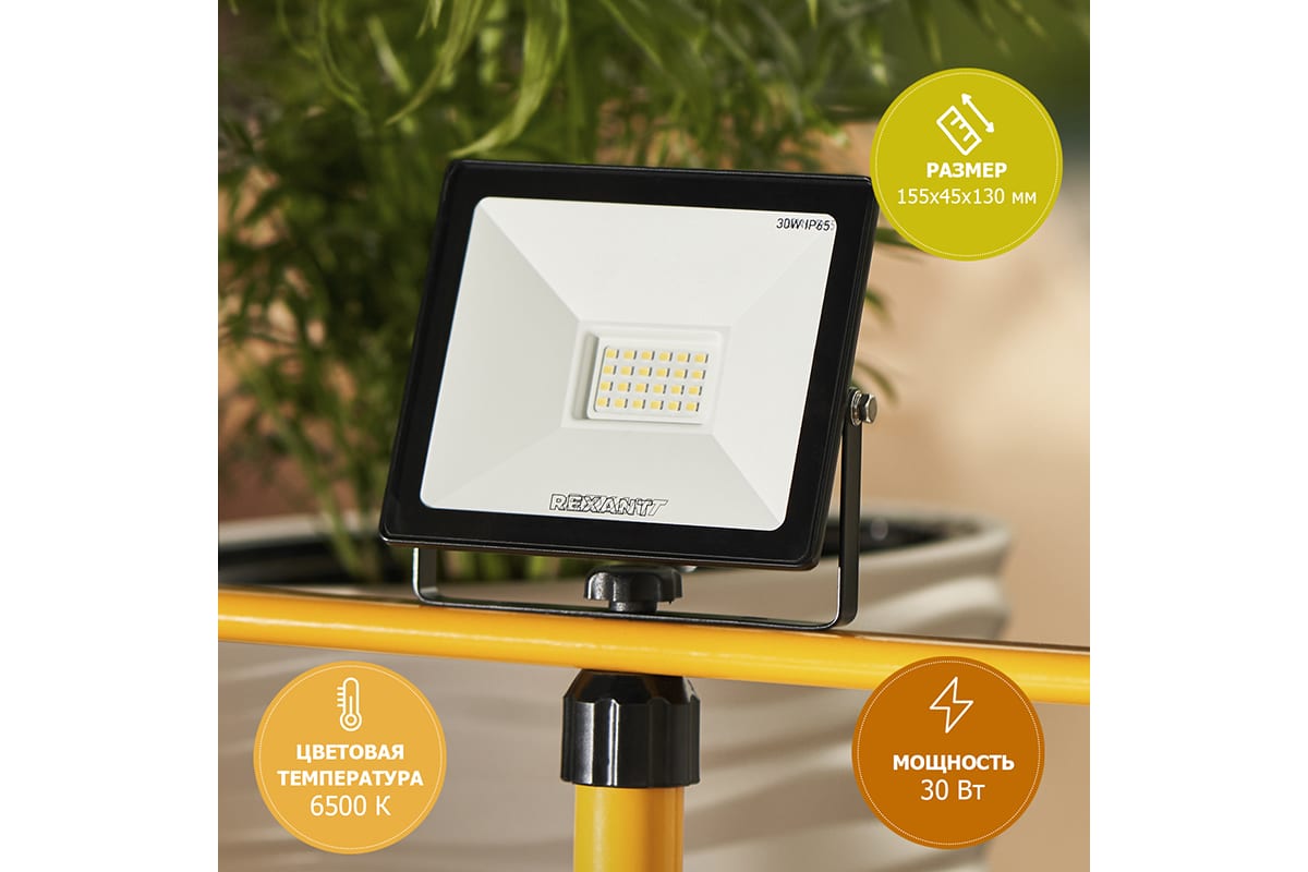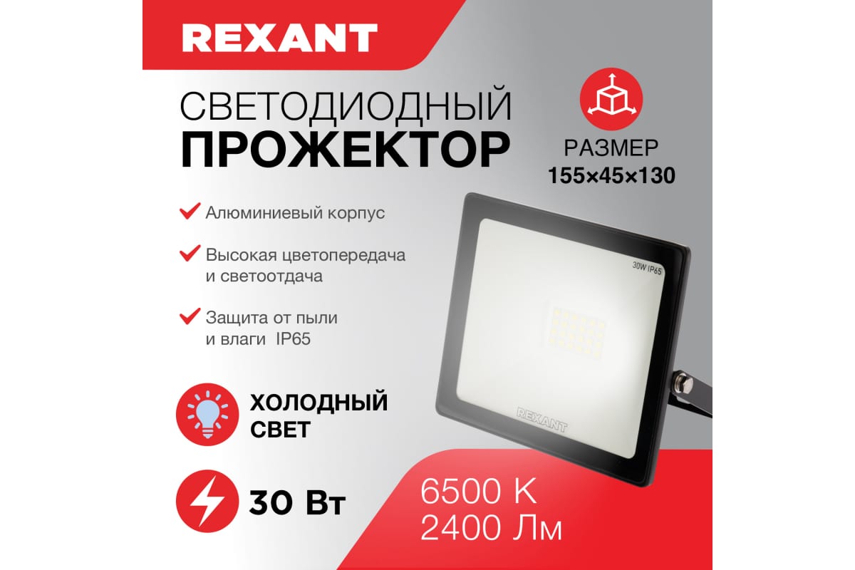 Технические характеристики REXANT 30Вт 200–260В IP65 2400лм 6500K холодный свет 605-003