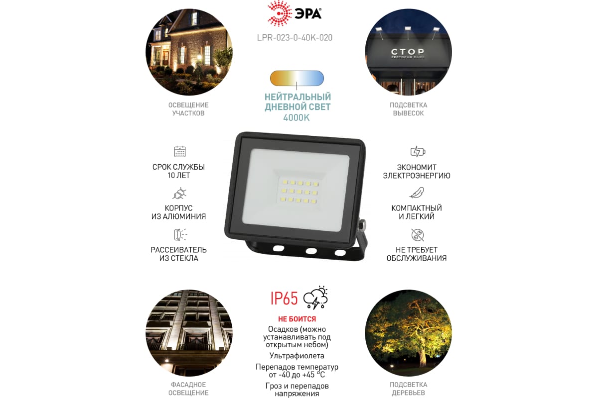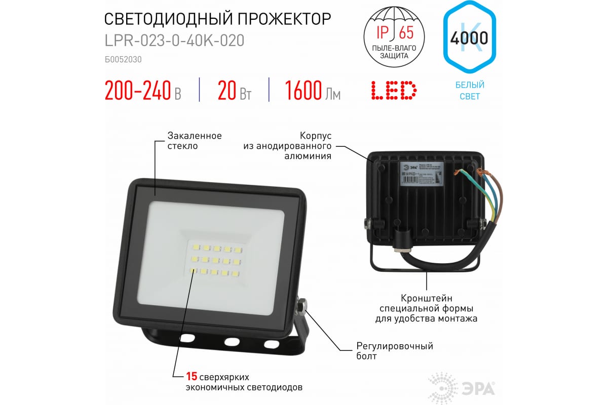 1.Светодиодный уличный прожектор ЭРА LPR-023-0-40K-020 20Вт 4000K 1600Лм 103х99х23,5 Б0052030 отличается простой и быстрой установкой: есть кронштейн специальной формы и регулировочные болты для выбора направления света.
