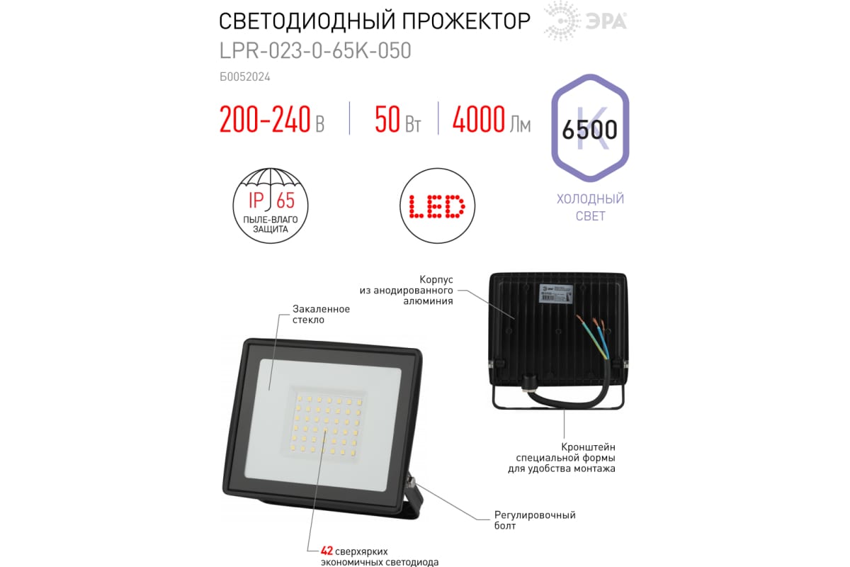 Технические характеристики ЭРА LPR-023-0-65K-050 50Вт 6500K 4000Лм 150х145х24 Б0052024