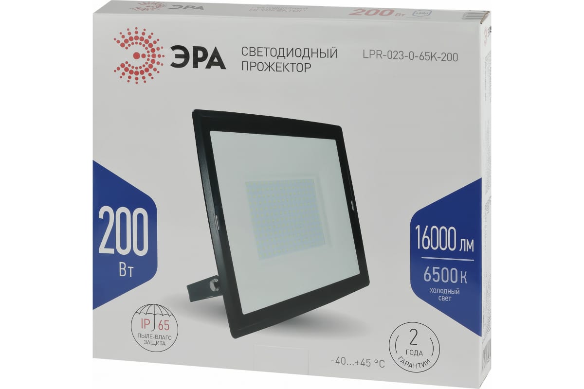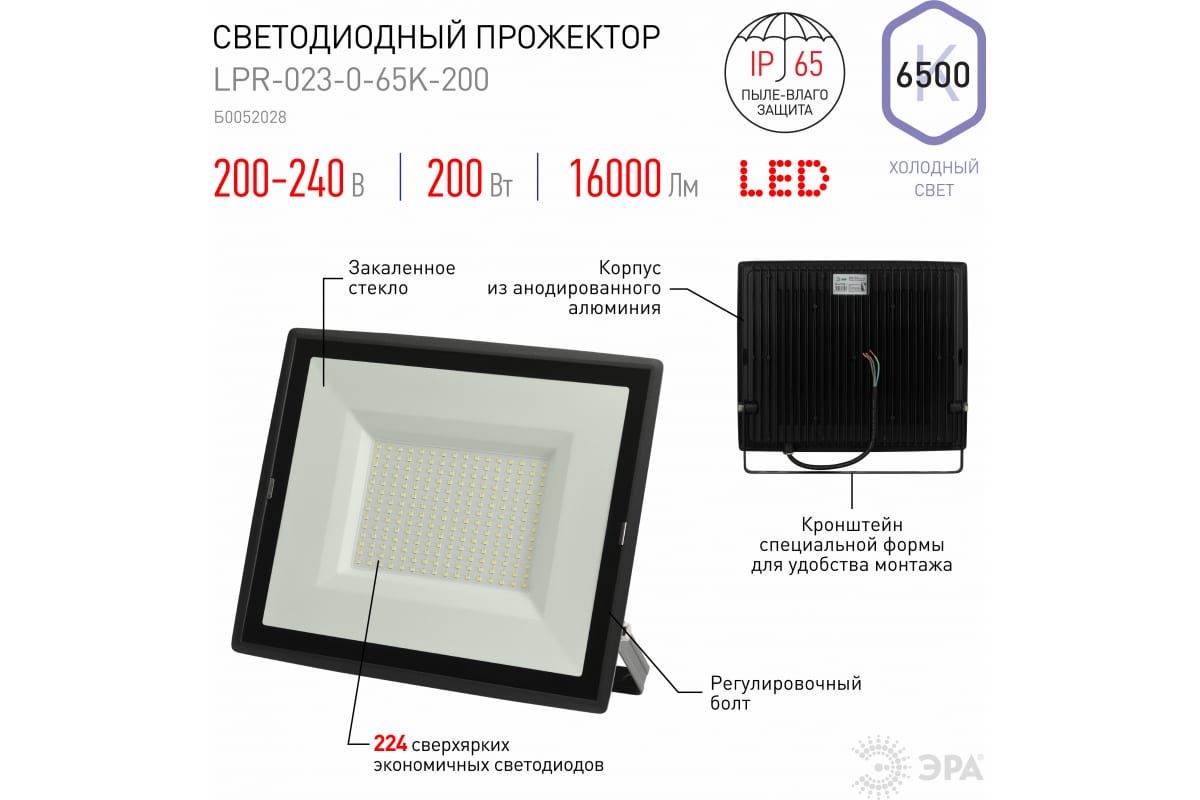 1.Светодиодный уличный прожектор ЭРА LPR-023-0-65K-200 200Вт 6500K 16000Лм 350х318х43 Б0052028 отличается простой и быстрой установкой: есть кронштейн специальной формы и регулировочные болты для выбора направления света.