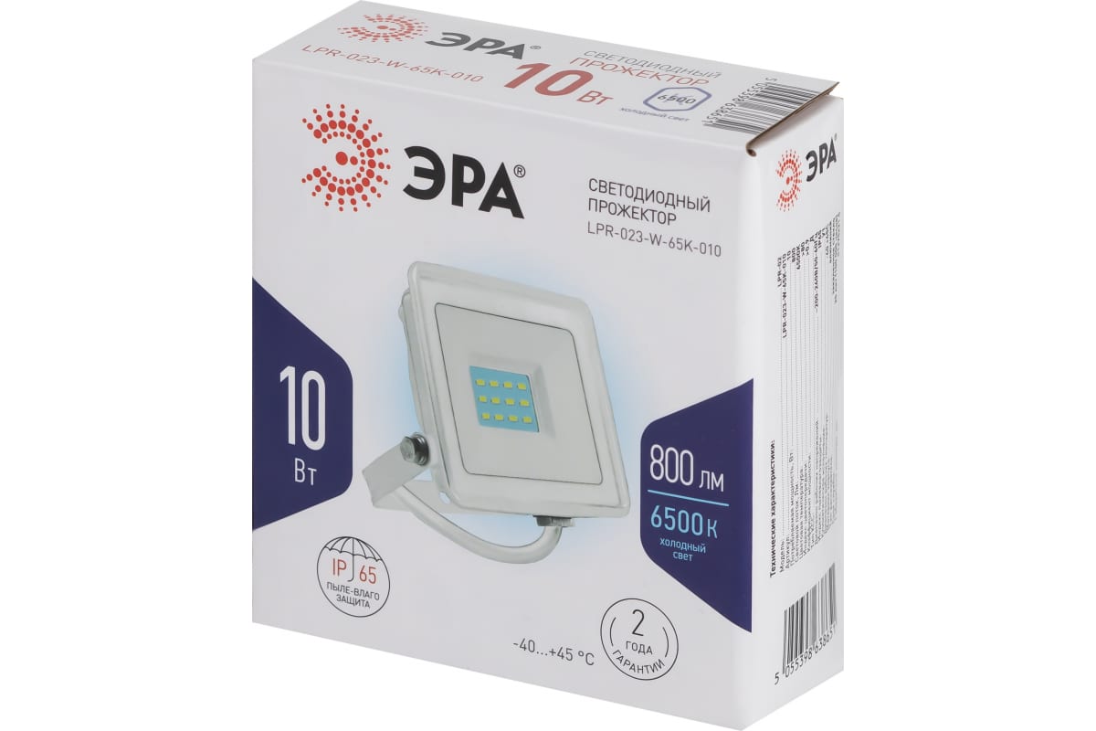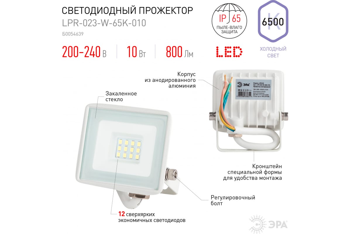 Светодиодный уличный прожектор ЭРА LPR-023-W-65K-010 10Вт 6500K 800Лм белый, Б0054639 устойчив к механическим воздействиям, защищен от дождя и пыли, работает при широком диапазоне температур (от -40 до +45).