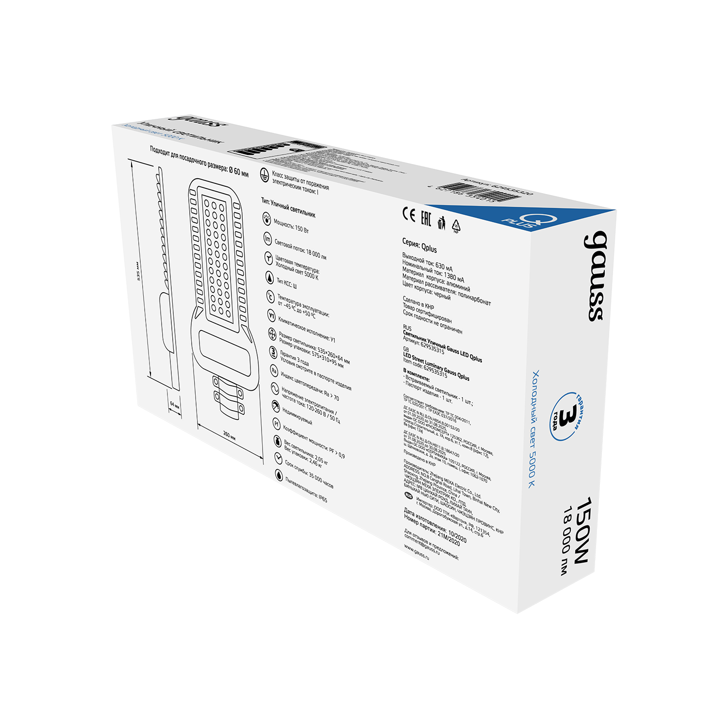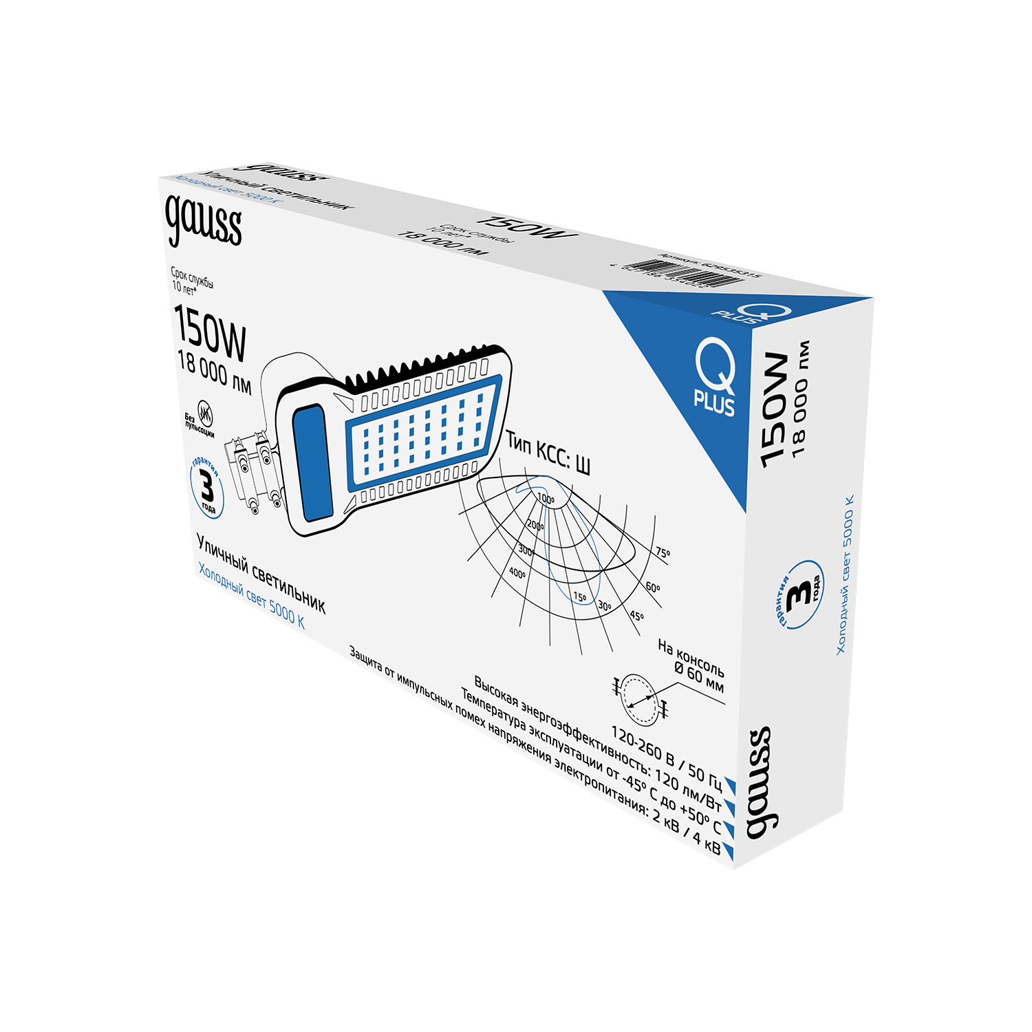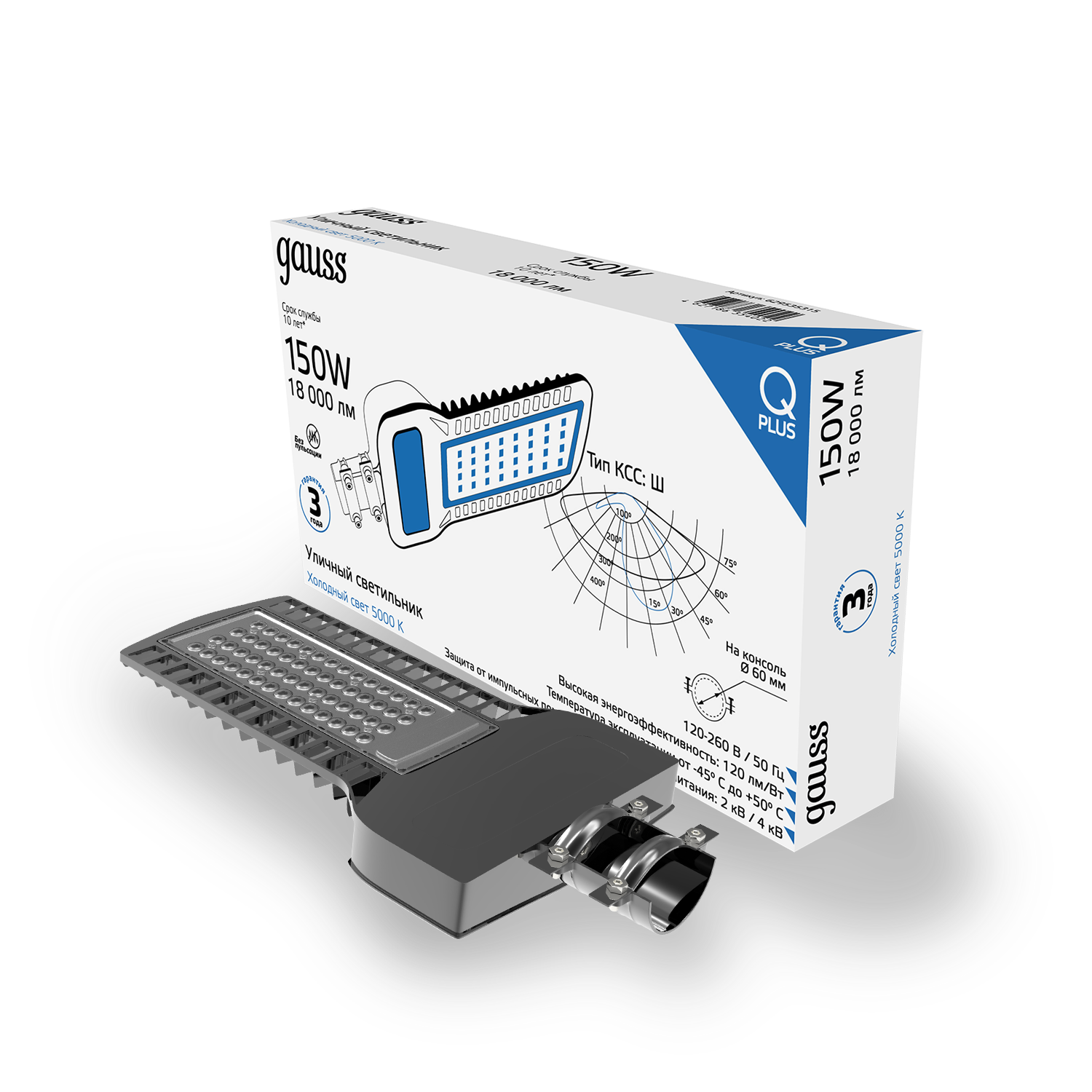 Светильник уличный консольный Gauss LED Qplus КСС "Ш" 150 W самый мощный из линейки. Он отлично подойдет для освещения промышленных объектов, дорог, парков; а так же жилых зон: придомовых территорий, дворов, аллей и загородных участков. Степень защиты IP65 означает максимальную защиту от пыли и воды (от брызг под давлением, как от поливочного шланга). Для монтажа на консоль светильник оснащен соплом и 4 крепежными болтами. Температура эксплуатации Gauss LED Qplus от -45 до +50 делает его универсальным для любых температурных зон.