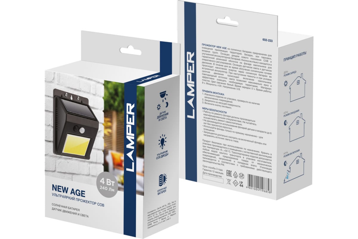 Технические характеристики Lamper NEW AGE XL 6500К на солнечной батарее, датчик движения COB на стену 602-233