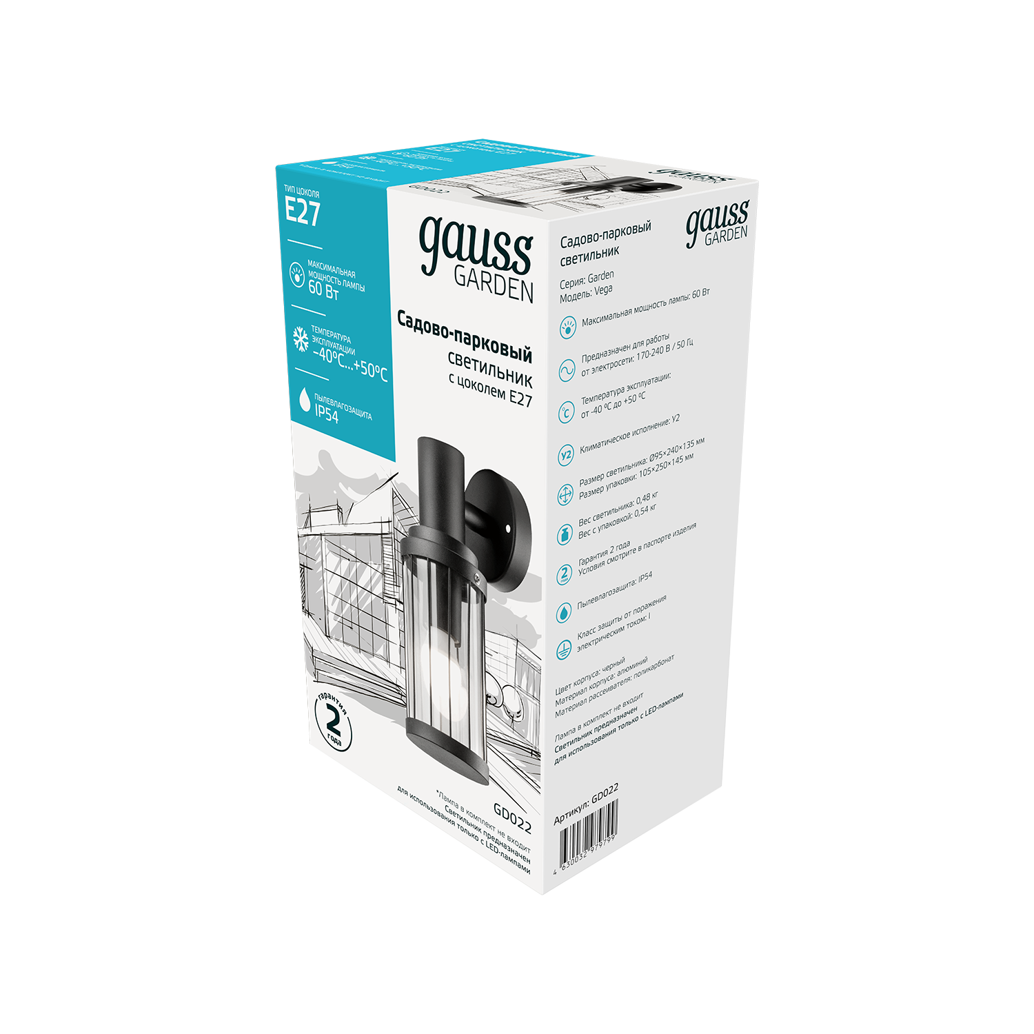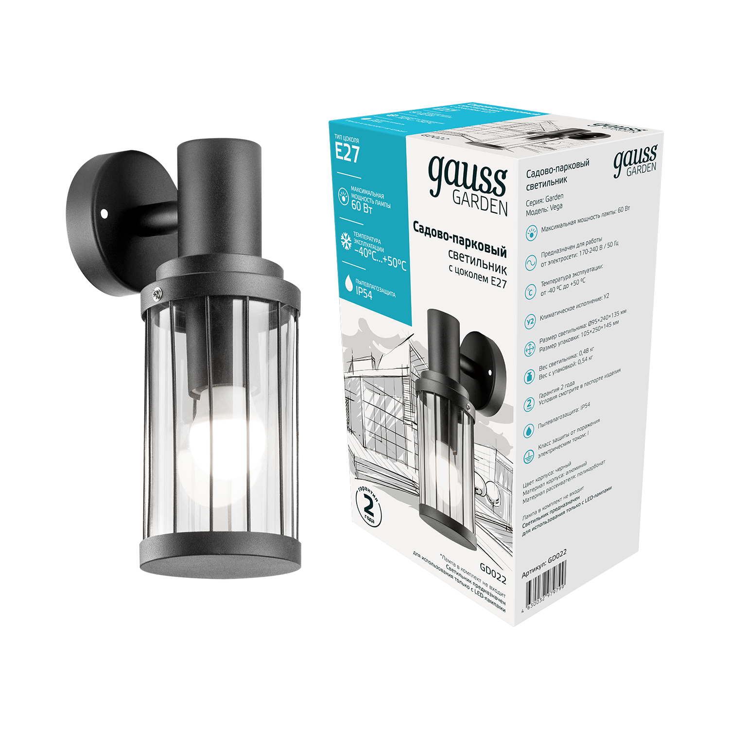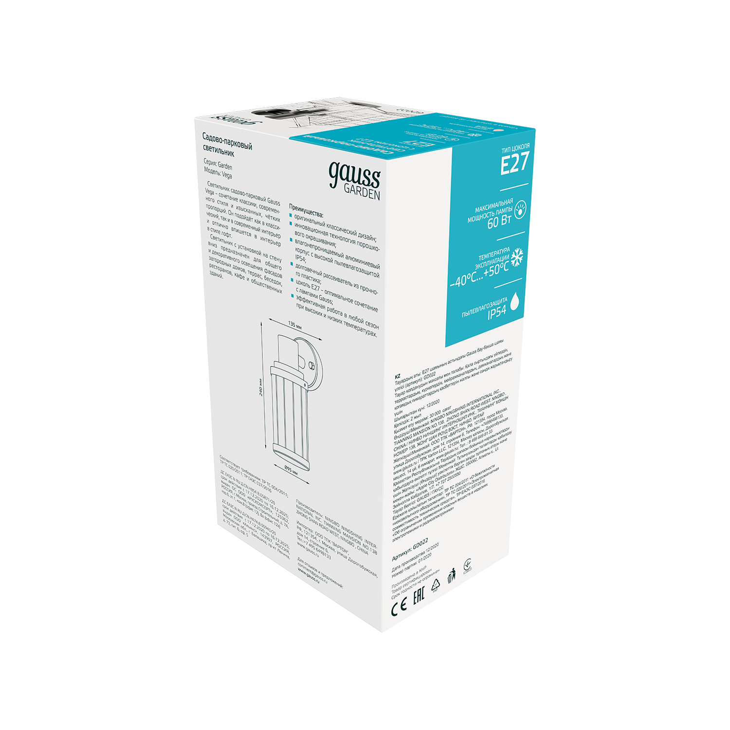 Светильник садово-парковый Gauss Vega настенный плафоном вниз выполнен в современном стиле с простыми четкими пропорциями. Он подойдет для большинства современных стилей, в особенности классика, лофт, минимализм. У светильника высокая степень защиты от окружающей среды IP54 и большой температурный диапазон от -40 до +50°С. Корпус изготовлен из алюминия с инновационным порошковым антикоррозийным покрытием черного цвета с прочным поликарбонатным рассеивателем. В светильник устанавливаются лампы с цоколем Е27 и мощностью до 60w.