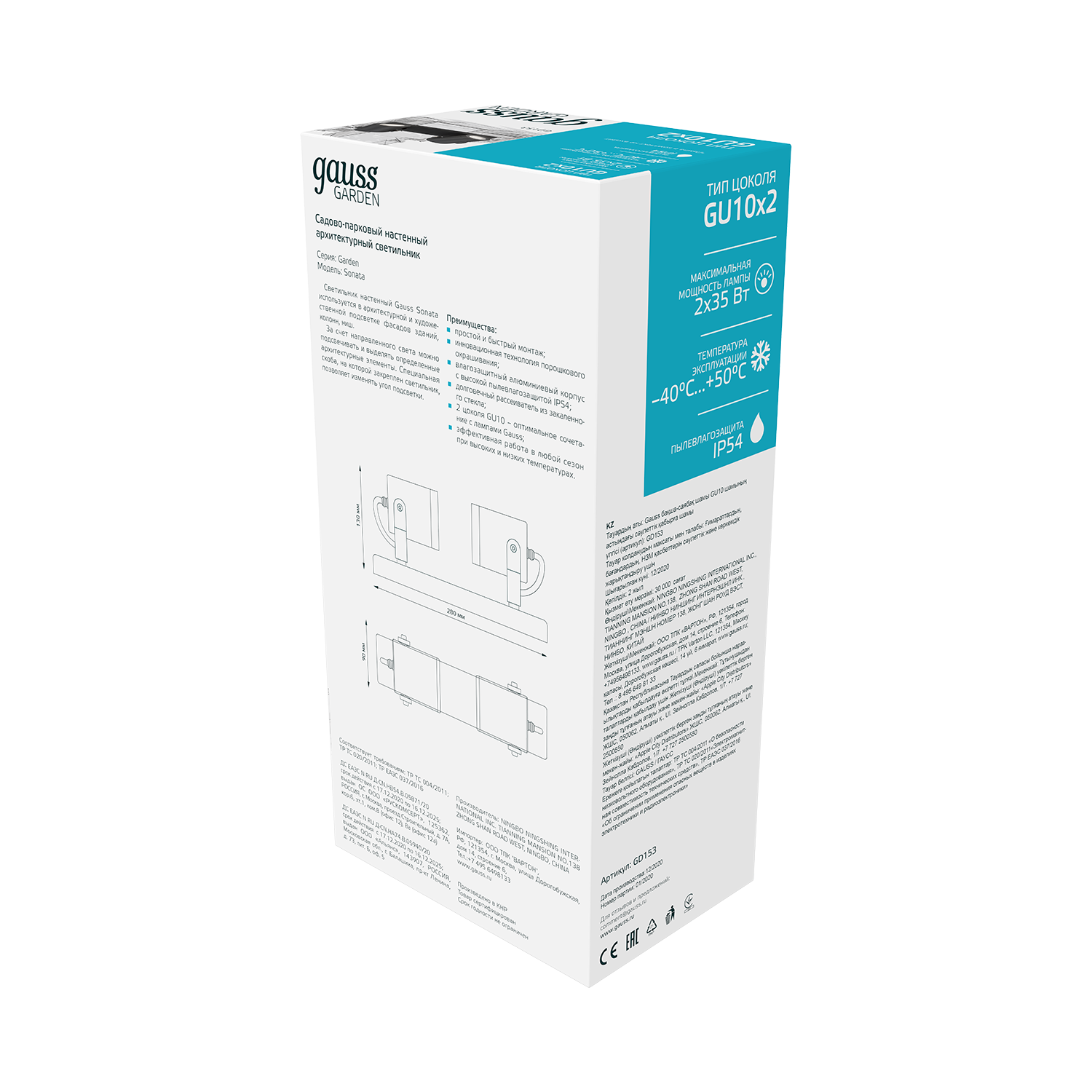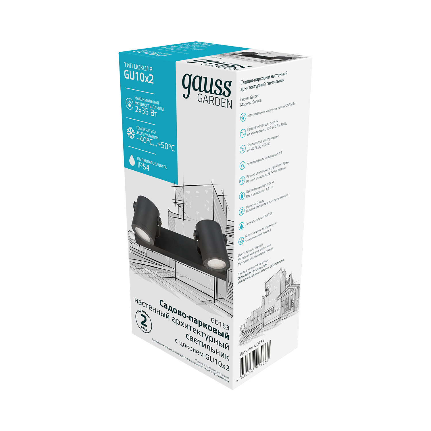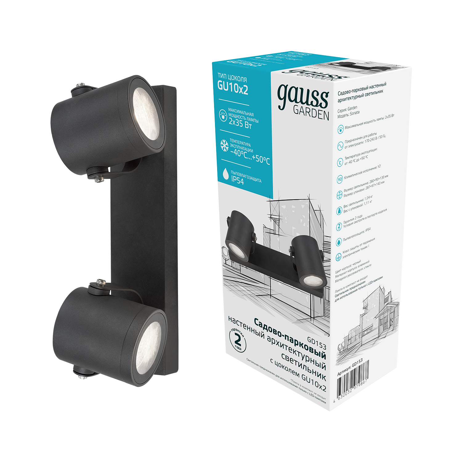 Светильник садово-парковый Gauss Sonata архитектурный настенный с двумя разведенными на панели спотами и поворотными скобами очень пластично может выделять ландшафтно-архитектурные элементы сада и патио и устанавливаться на фасады дома, веранды, беседок, пергол. Он изготовлен из покрытого антикоррозийной порошковой краской алюминия. Максимальная мощность ламп до 60Вт (2 по 35вт), с патронами для ламп GU10. Материал рассеивателя - закаленное прозрачное стекло. Уровень пылевлагозащиты IP54 позволяет не опасаться устанавливать светильники на открытых пространствах в любые времена года.