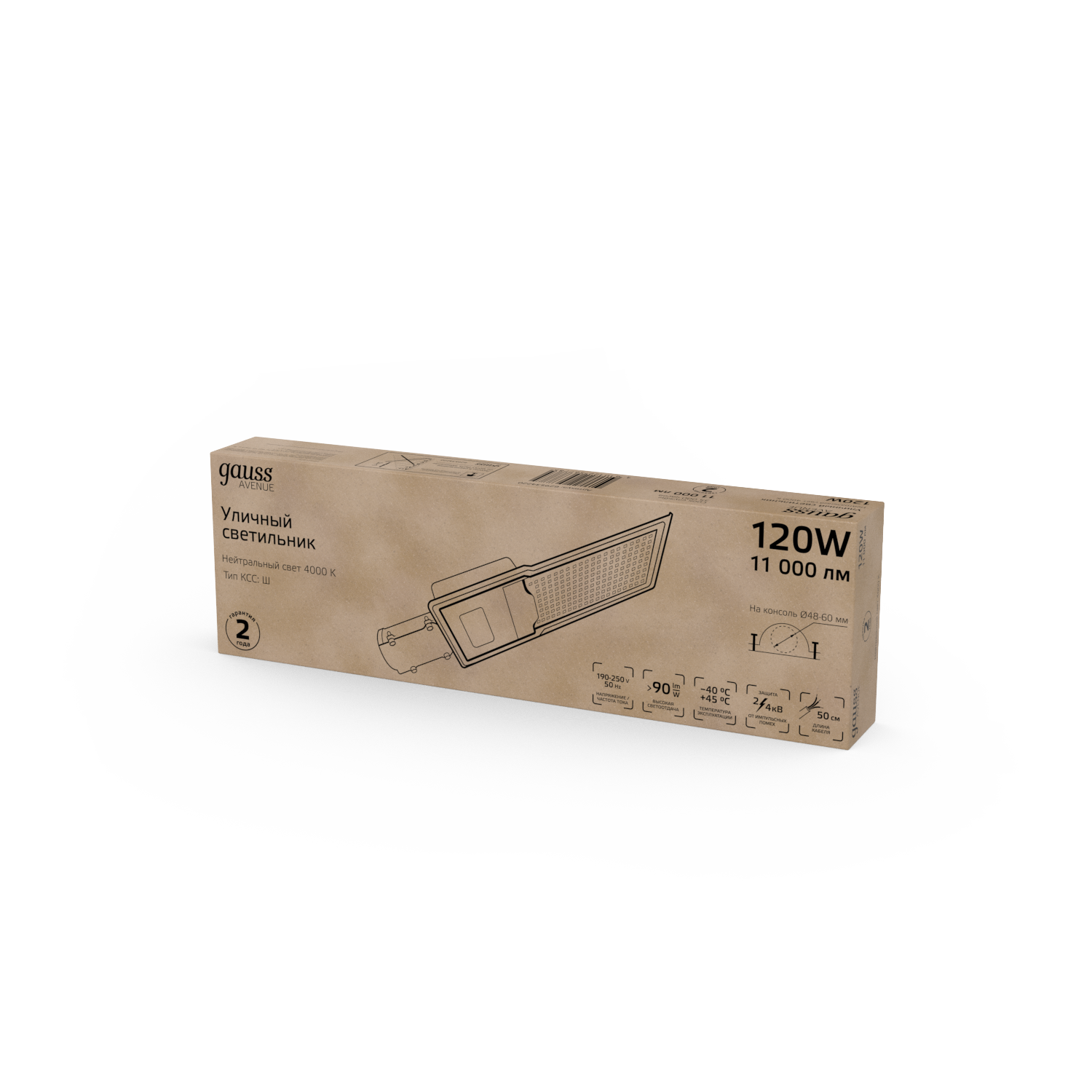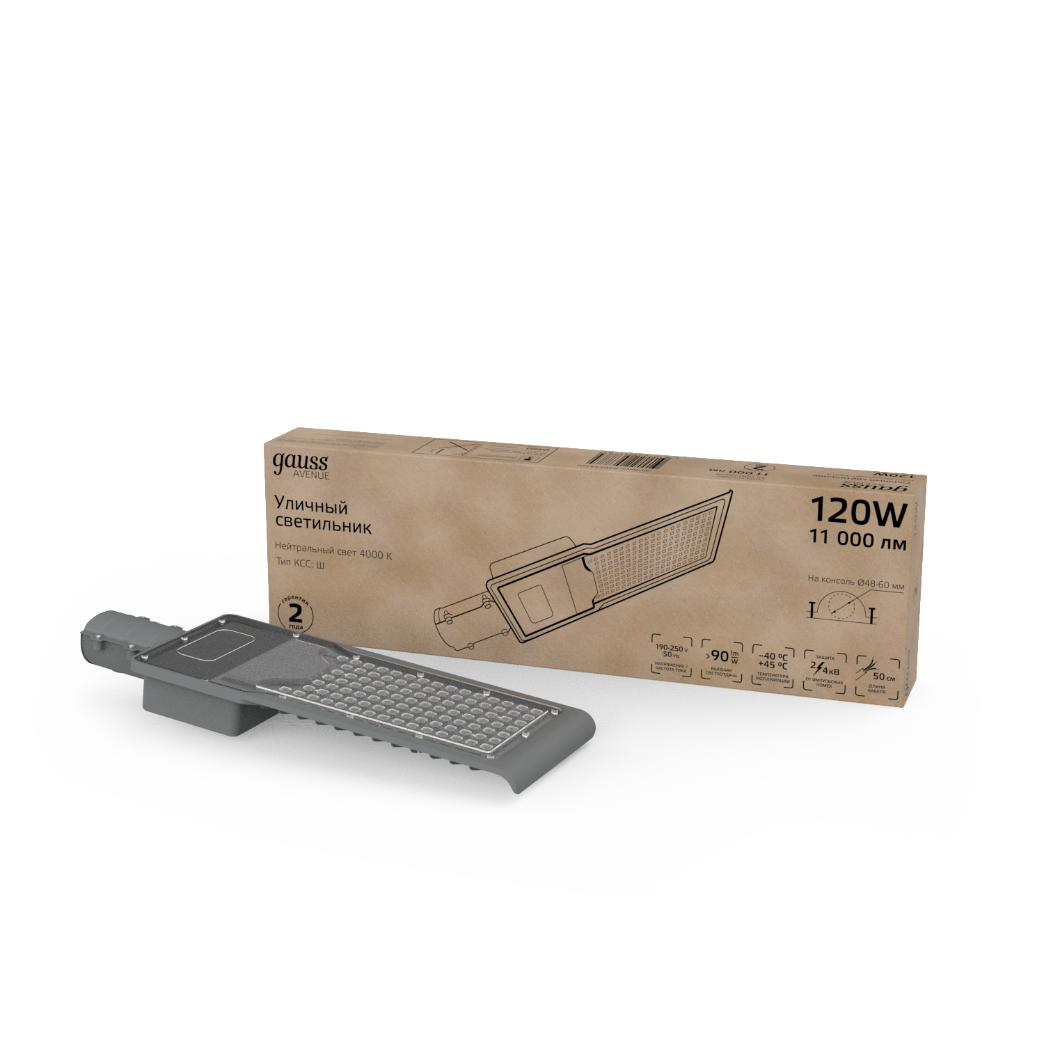 Светильник уличный Gauss LED Avenue 120W это консольный LED светильник, корпус которого изготовлен из анодированного алюминия и прозрачного пластикового рассеивателя. У него высокий уровень пылевлагозащиты IP 65 и защиты от импульсных помех. Светильник легко монтируется на консоль. Работает в большом диапазоне температур от -40 до +45°С и имеет холодный белый свет 4000К, который дает максимальное освещение необходимой территории. Светильник не боится грозы, может использоваться для освещения улиц, участков дорог, придомовых территорий, парковых аллей.