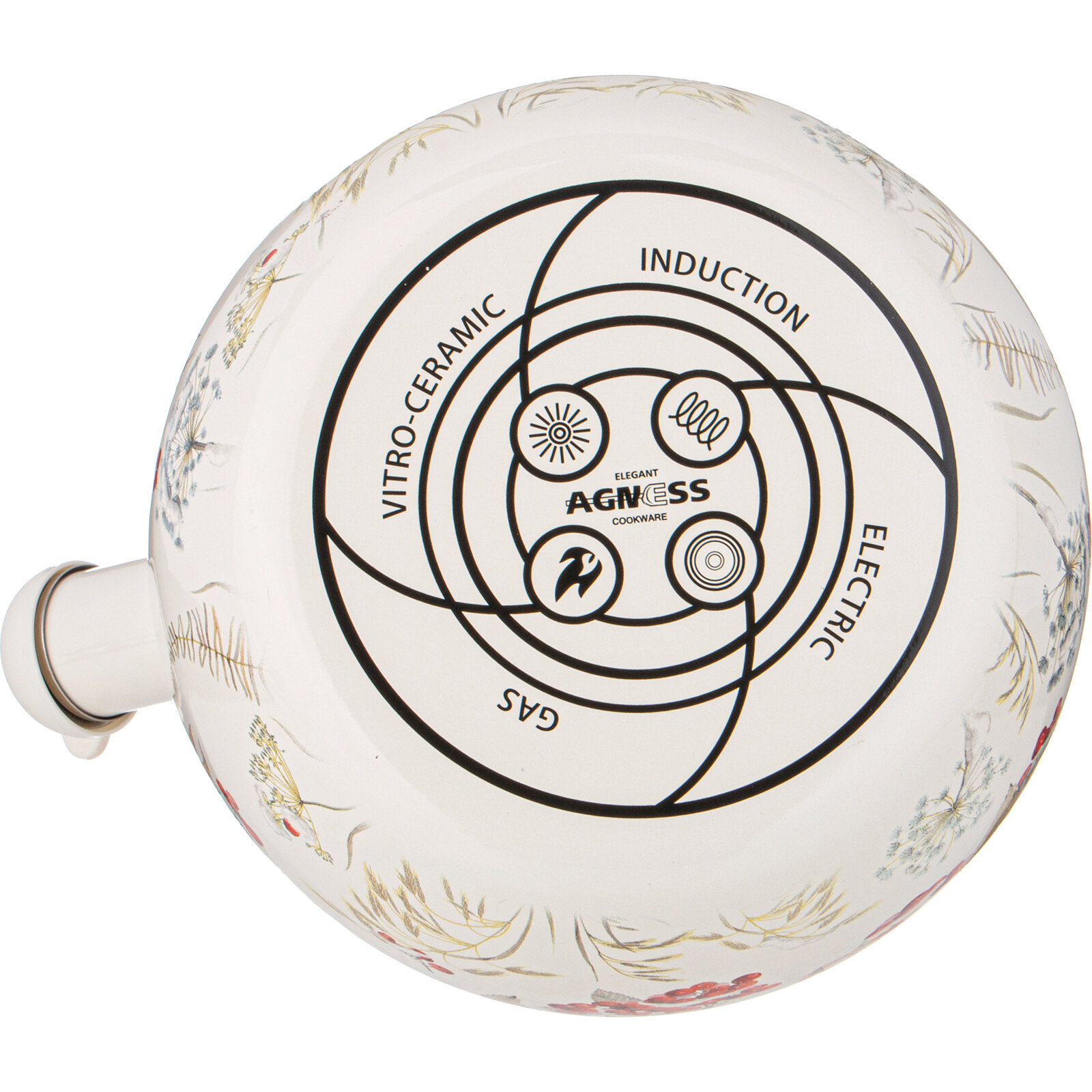 Эмалированная посуда AGNESS - отличный выбор для Вашей кухни! Эмалированная посуда обладает рядом преимуществ: • Эмалированная посуда не требует особого ухода и легко моется • Эмалированная посуда гигиенична - не удерживает болезнетворных микробов и бактерий • Удобная ненагревающаяся ручка • Легко наливать воду. Используя клапан на ручке чайника, вы легко сможете налить воду. Просто нажмите на клапан, чтобы открыть носик чайника. • Эмалированная посуда подходит для всех видов плит, включая ИНДУКЦИОННЫЕ ПЛИТЫ. • Посуда проходит 3 этапа обжига, эта технология позволяет сохранить яркость расцветок деколи, а также придает прочность эмалированной посуде • Все деколи наносятся вручную, а затем обжигаются при температуре около 800 С • Толщина стенок и дна посуды 0,8мм • Диаметр дна 13см, высота 21см и ширина с носиком 22 см. Правила ухода за эмалированной посудой просты: • Не использовать абразивные чистящие средства; • Мыть с применением нейтральных моющих средств. • Избегать резкого перепада температур. • Не нагревать пустой чайник, а также не допускать выкипания воды • При транспортировке, хранение и спользовании необходимо оберегать эмалированную посуду от механических повреждений