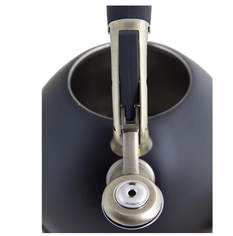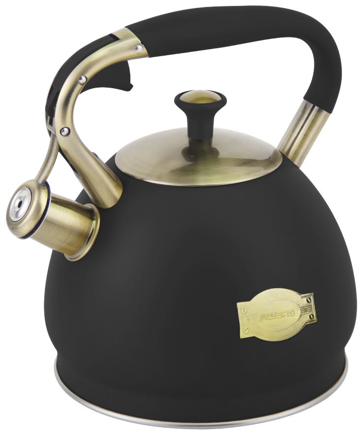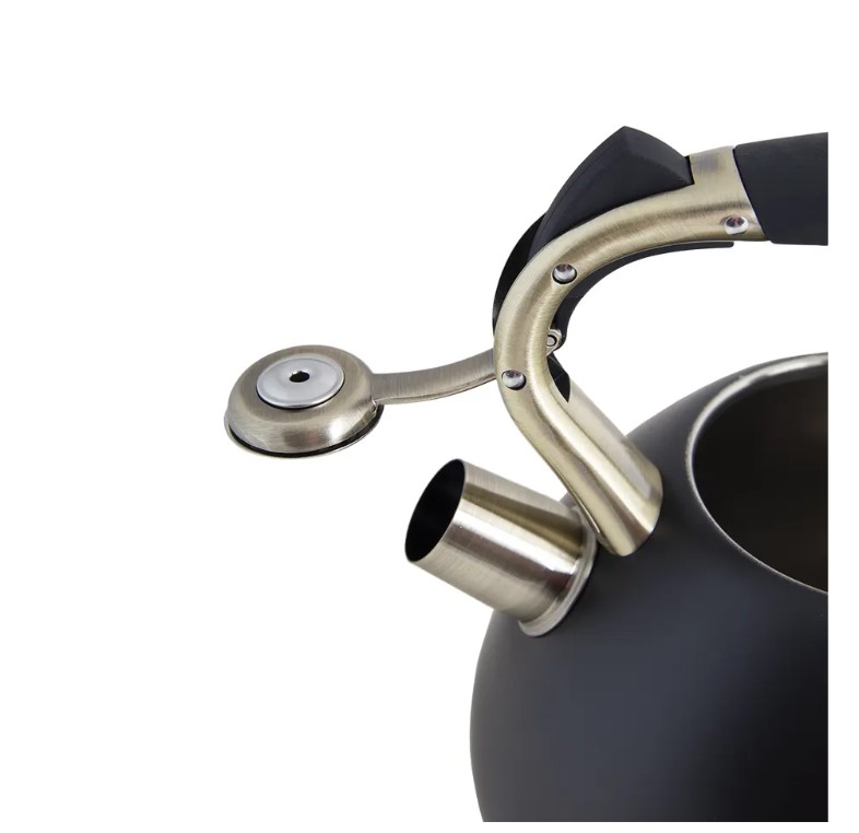 Объем: 3 л Свисток с курковым механизмом открывания Высококачественная нержавеющая сталь Внешнее антипригарное цветное покрытие, устойчивое к высоким температурам Толщина стенок: 0.5 мм Толщина дна: 4.5 мм Фиксированная бакелитовая ручка с цветным покрытием Soft-Touch Многослойное термоаккумулирующее капсулированное индукционное дно Подходит для всех видов плит, включая индукционные Вес чайника: 850 г