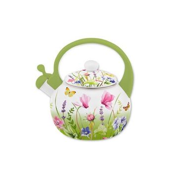 Чайник эмалированный со свистком и с пластиковой ручкой.