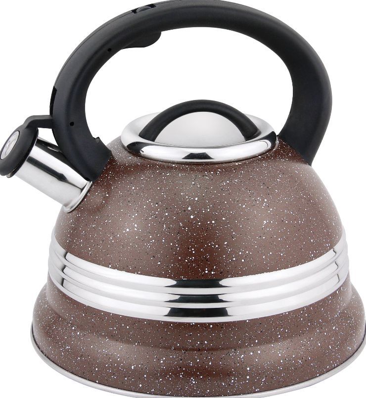 3,2л. со свистком, ручка пластмассовая, черная; крышка из нержав. стали в комбинации с пластиком; капсулированное дно (толщина 2,5 мм), стенка 0,35мм.; цветной корпус под мрамор. Подходит для всех типов плит, в т.ч. индукционных. Не подходит для посудомоечных машин. Состав: нержав. сталь.