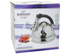 Чайник со свистком Bohmann BH-8084 оборудован свистком для определения закипания воды и изготовлен из высококачественной нержавеющей стали. Корпус из данного материала долговечен, не подвергается коррозии и обладает антиаллергенными свойствами. Фиксированная ручка модели удобно ложится в ладонь. На ней находится механизм открытия носика-свистка. Широкое капсульное дно распределяет тепло равномерно по всей поверхности, что обеспечивает быструю скорость закипания воды и устойчивость изделия. Крышка практически не пропускает пар, поэтому вода долго остается горячей. Изящная форма чайника и отполированная поверхность корпуса придают ему эстетичности на столе.Подходит для использования на индукционной плите и мытья в посудомоечной машине.