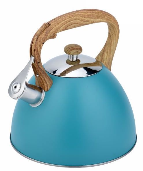 Чайник 3 л со свистком. Индукционное однослойное дно. Цвет корпуса: голубой. Бакелитовая ручкач c силиконовым напылением деревянного цвета. 3 л. Упакован в коробку.