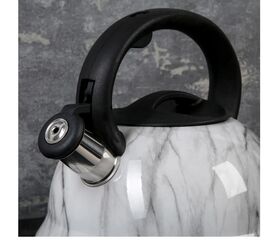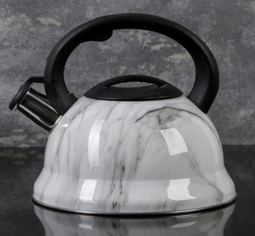 Чайник со свистком Доляна «Каррар», 2,8 л Габариты и вес Размер (Длина х Ширина х Высота) 26 см х 22,5 см х 19,5 см Вес брутто 686 г Особенности Цвет Белый, Серый Объём, л 2.8 Рисунок Да Материал Нержавеющая сталь Тип плиты Для газовой плиты, Для галогенной плиты, Для стеклокерамической плиты, Для электрической плиты Теплоизолированная ручка Да