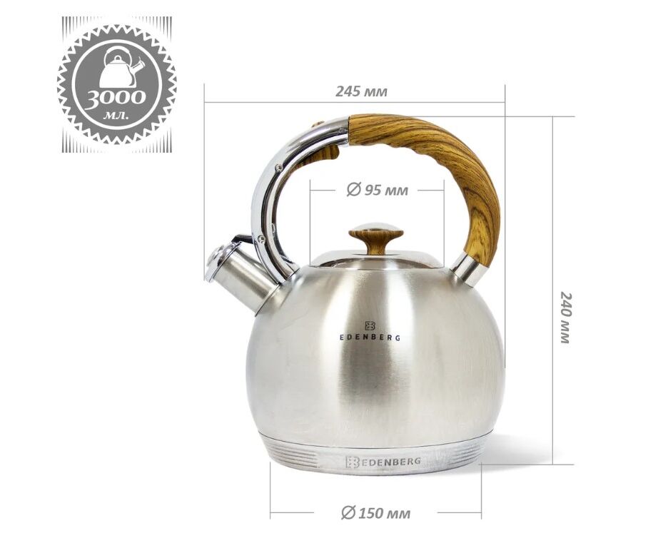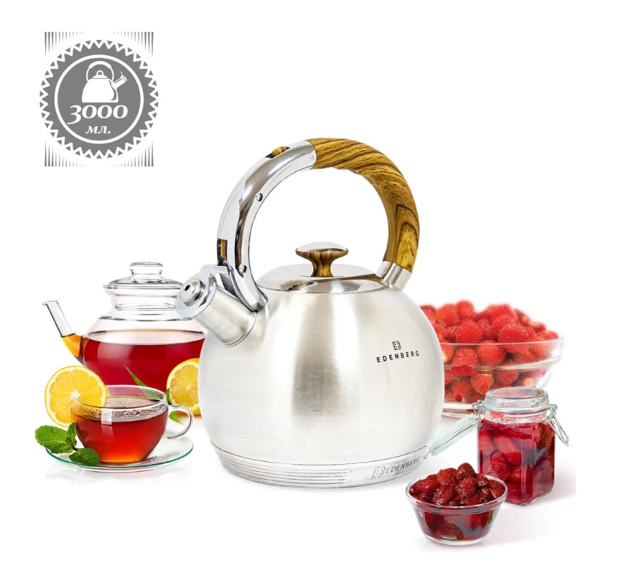 Чайник из нержавеющей стали на 3 литра станет неотъемлемой частью Вашей кухни. Индукционное дно из нержавеющей стали прекрасно подойдет как для индукционных плит, так и для газовых, электрических или стеклокерамических. Цвет товара серебристый/черный Тип чайник Объем 3 л Материал корпуса нержавеющая сталь Покрытие полированный Тип полировки зеркальная Особенности термоизолированная ручка, со свистком Материал крышки нержавеющая сталь, бакелит Материал ручки бакелит Вид ручки фиксированная Мытьё в посудомоечной машине да