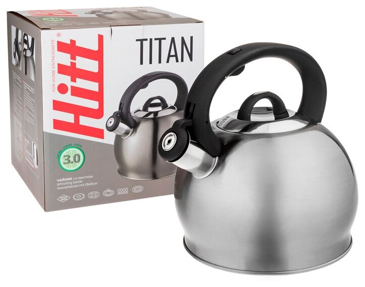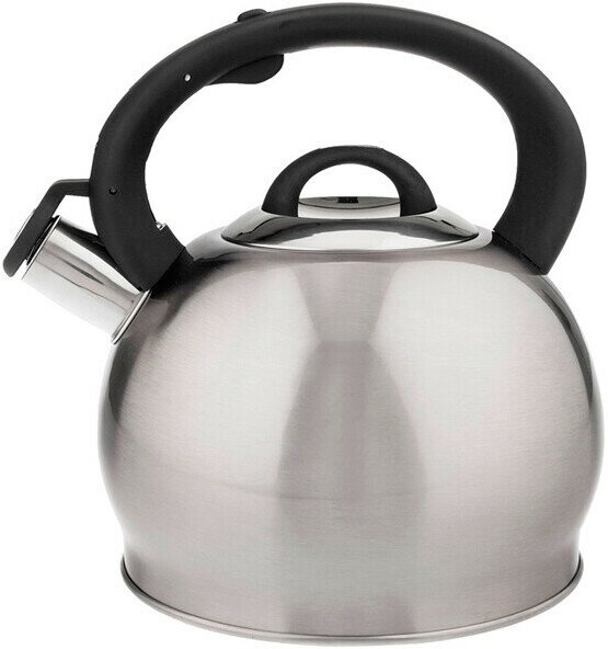 Чайник для плиты серого цвета выполнен из нержавеющей стали, благодаря чему надолго сохраняет свои функции. Его вместительность составляет 3 л, а значит, чайник подходит для использования в большой семье или рабочем коллективе. Специальная конструкция днища чайника предусматривает возможность его эксплуатации на индукционных плитах. Удобная ручка из термостойкого пластика позволяет легко удерживать горячий чайник в руке. Из такого же материала сделана ручка на крышке прибора.