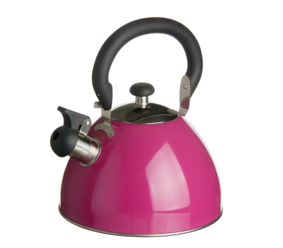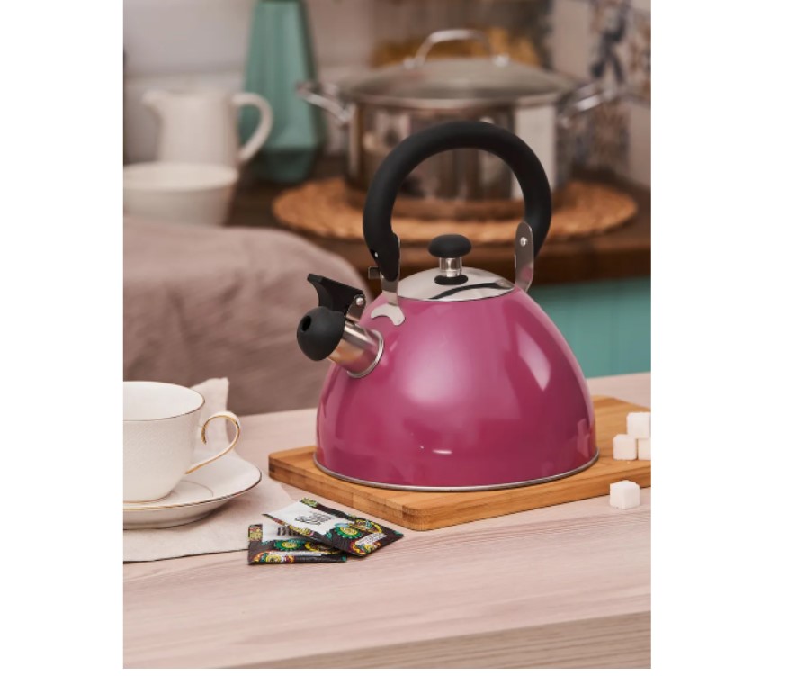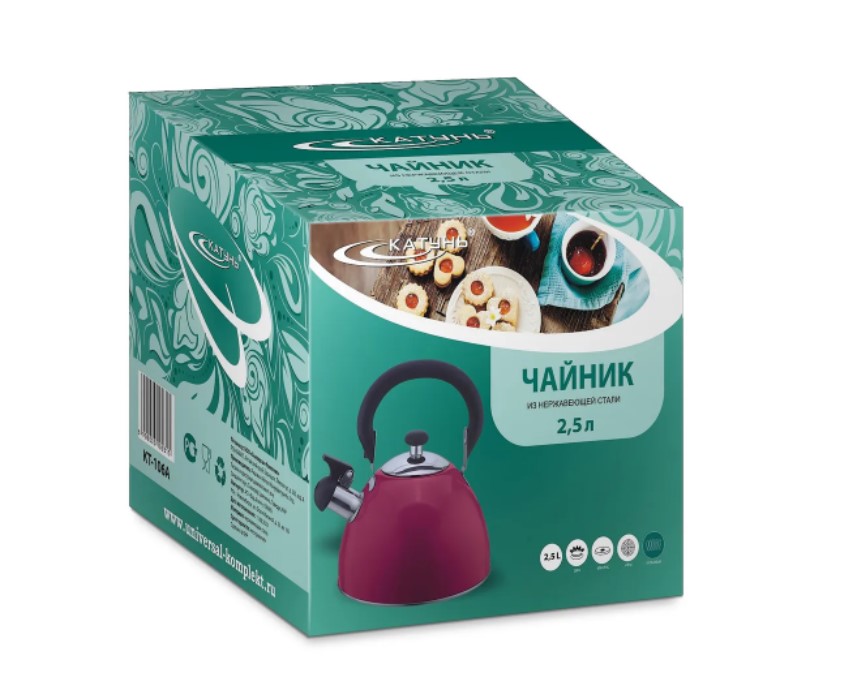 Чайник изготовлен из высококачественной нержавеющей стали. Бакелитовые ручки чайника практически не нагреваются, а курковый механизм позволяет легко поднимать насадку-свисток. Чайник имеет цветное внешнее покрытие, цвет бирюзовый. Широкое цельнометаллическое однослойное дно распределяет тепло равномерно по всей поверхности, что обеспечивает быструю скорость закипания воды и устойчивость изделия. Подходит для всех видов плит, кроме индукционных.