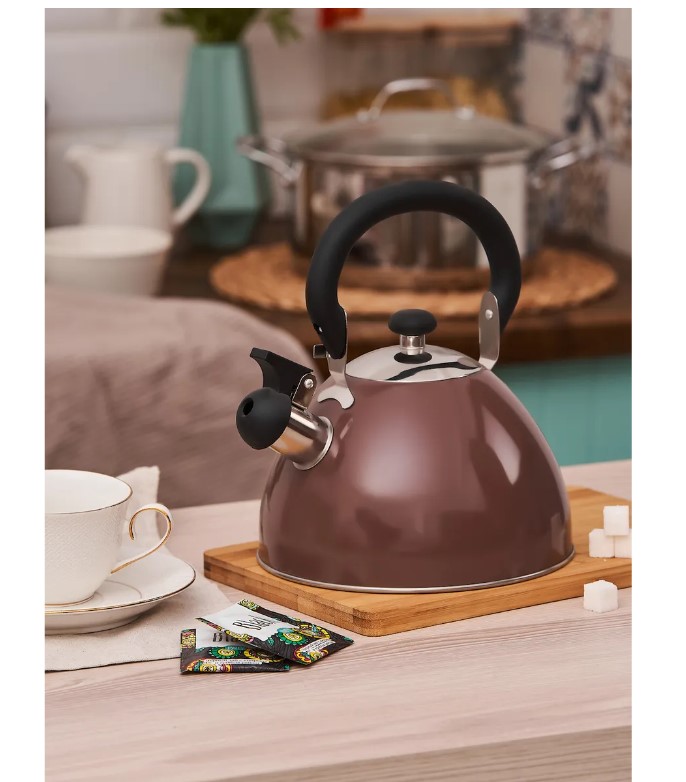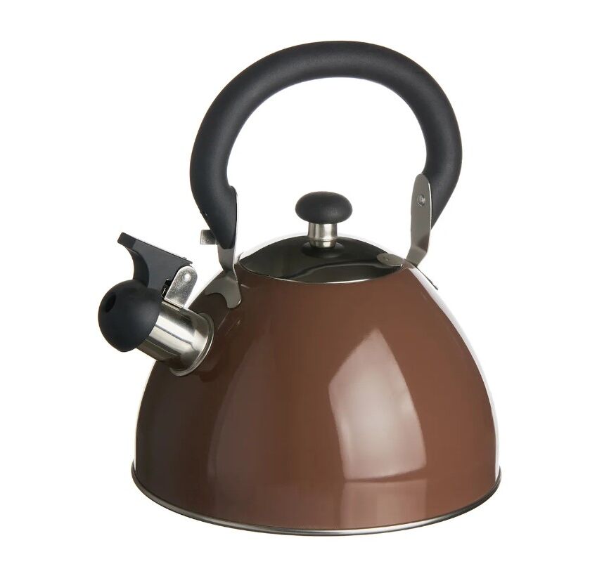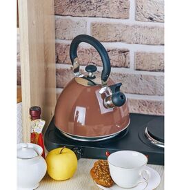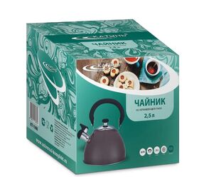 Чайник изготовлен из высококачественной нержавеющей стали. Бакелитовые ручки чайника практически не нагреваются, а курковый механизм позволяет легко поднимать насадку-свисток. Чайник имеет цветное внешнее покрытие, цвет бирюзовый. Широкое цельнометаллическое однослойное дно распределяет тепло равномерно по всей поверхности, что обеспечивает быструю скорость закипания воды и устойчивость изделия. Подходит для всех видов плит, кроме индукционных.