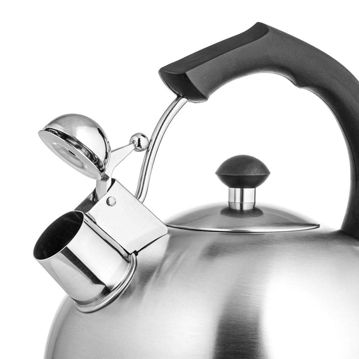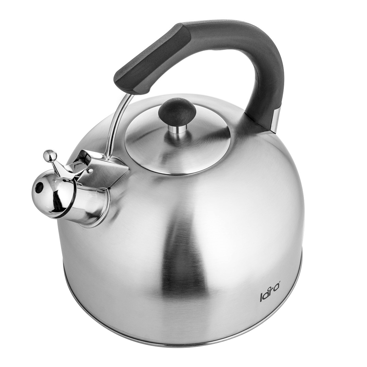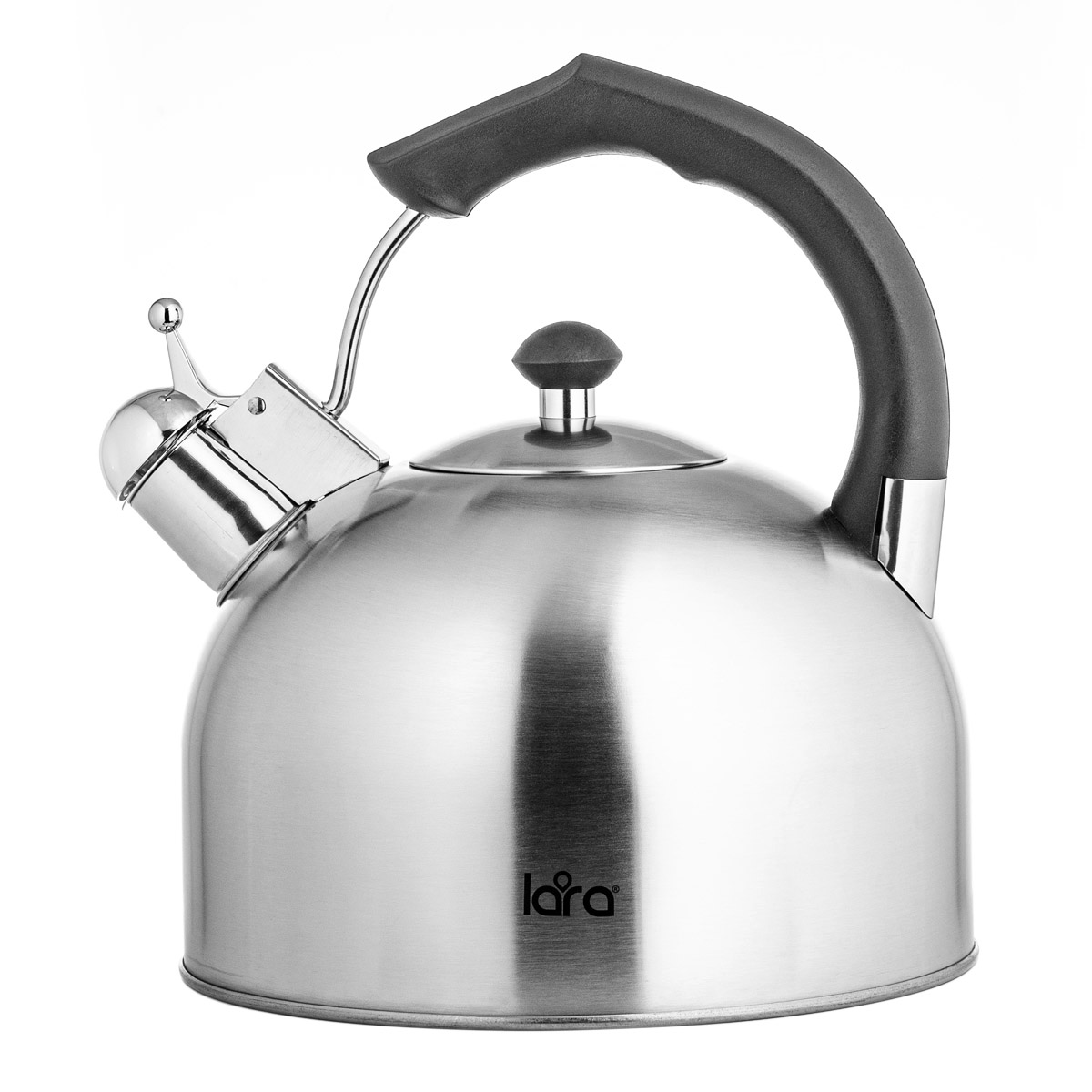 Вместительный чайник LARA со свистком в классическом корпусе. Отличный помощник на вашей кухне! Объем чайника позволяет устроить чаепитие для большой компании. Свисток снабжен рычагом для открывания носика. Широкая горловина для удобного залива воды при необходимости. Корпус чайника изготовлен из высококачественной нержавеющей стали с матовой полировкой внутри и снаружи. Толстое индукционное дно подходит для использования на всех типах плит. Ненагревающаяся нейлоновая ручка черного цвета обеспечивает удобный хват. Стильная ненагревающаяся крышка с пластиковой ручкой дополняет внешний вид.
