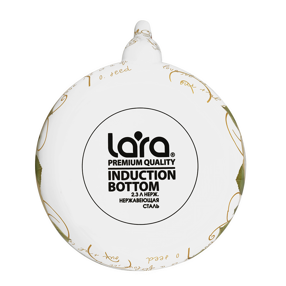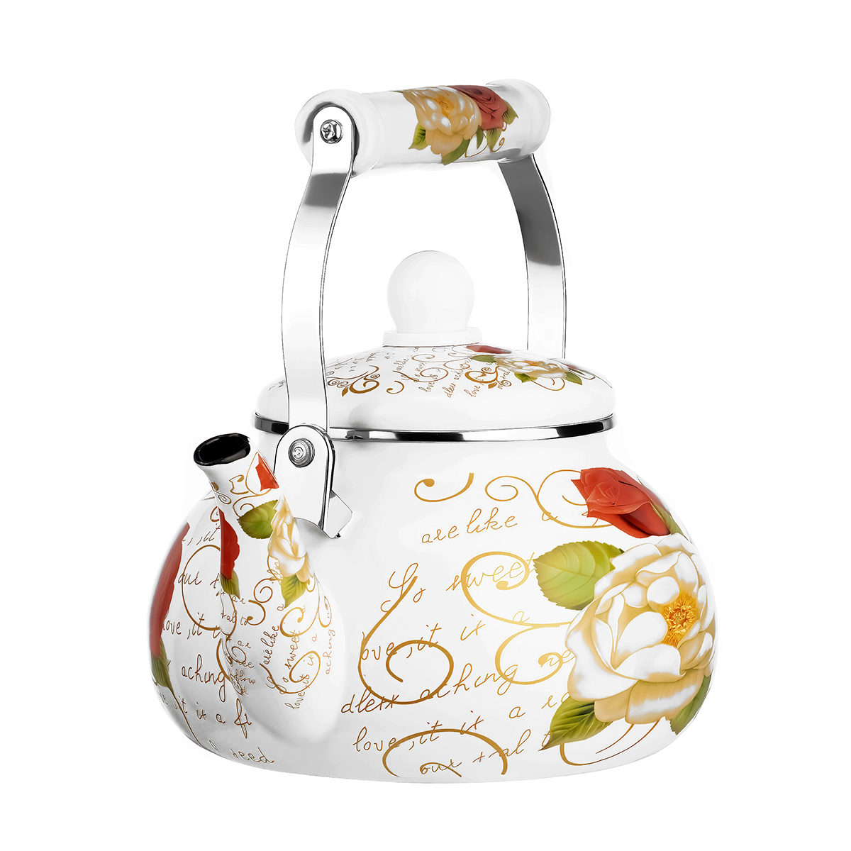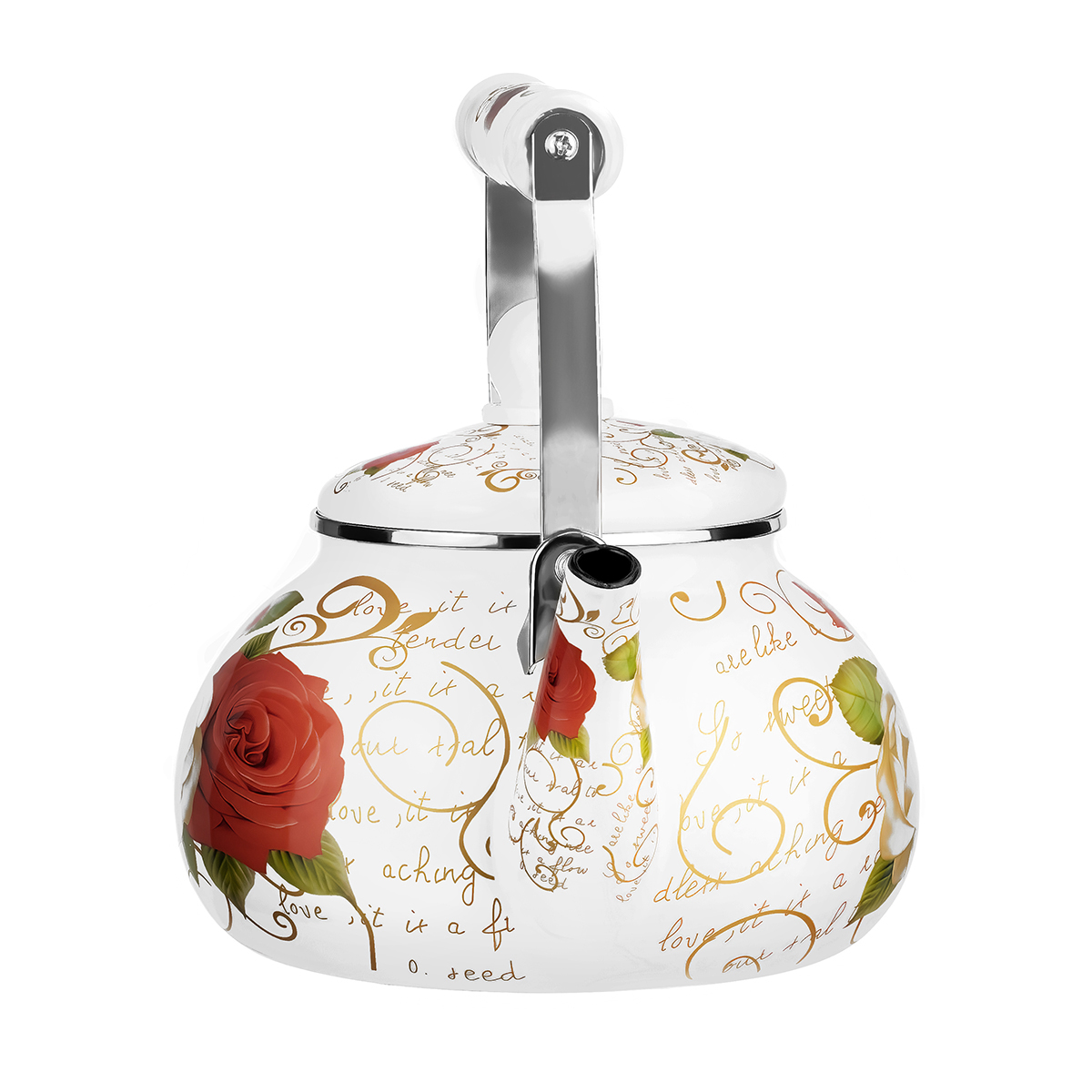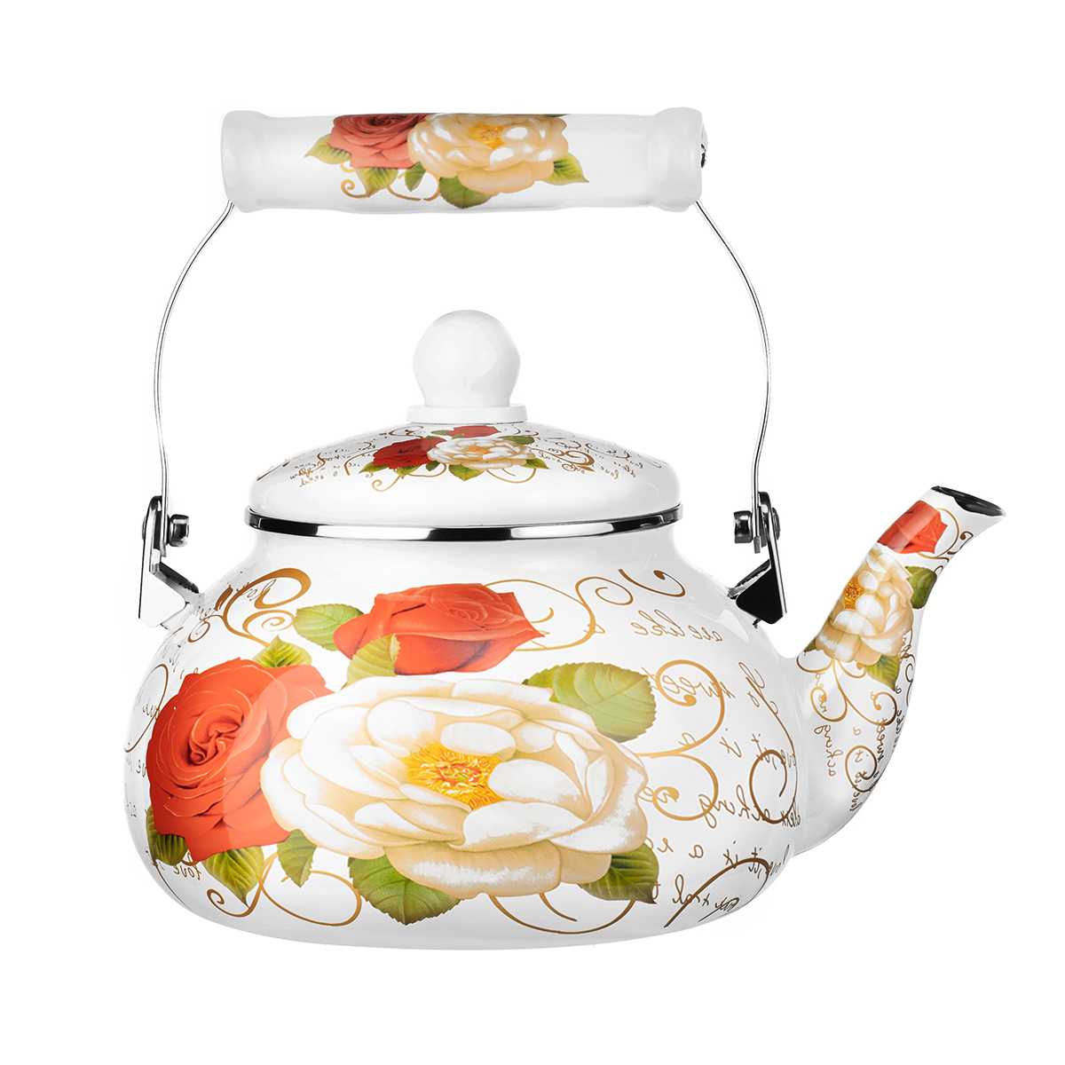 Классический эмалированный чайник LARA с элегантным дизайном и декорированием деколью – это практичный и экологичный помощник на вашей кухне. Эмалевое покрытие чайника дольше сохраняет тепло. Чайник с цветочным орнаментом украсит кухонный интерьер. Широкая горловина для удобного залива воды. Чайник изготовлен из качественной углеродистой стали. Корпус покрыт трехслойным эмалированным покрытием внутри и снаружи. Эмаль устойчива к бактериям, легко моется и не впитывает посторонние запахи. Удобная складная ручка выполнена из нержавеющей стали и имеет ненагревающуюся керамическую вставку для безопасного хвата. Индукционное дно подходит для всех типов плит.