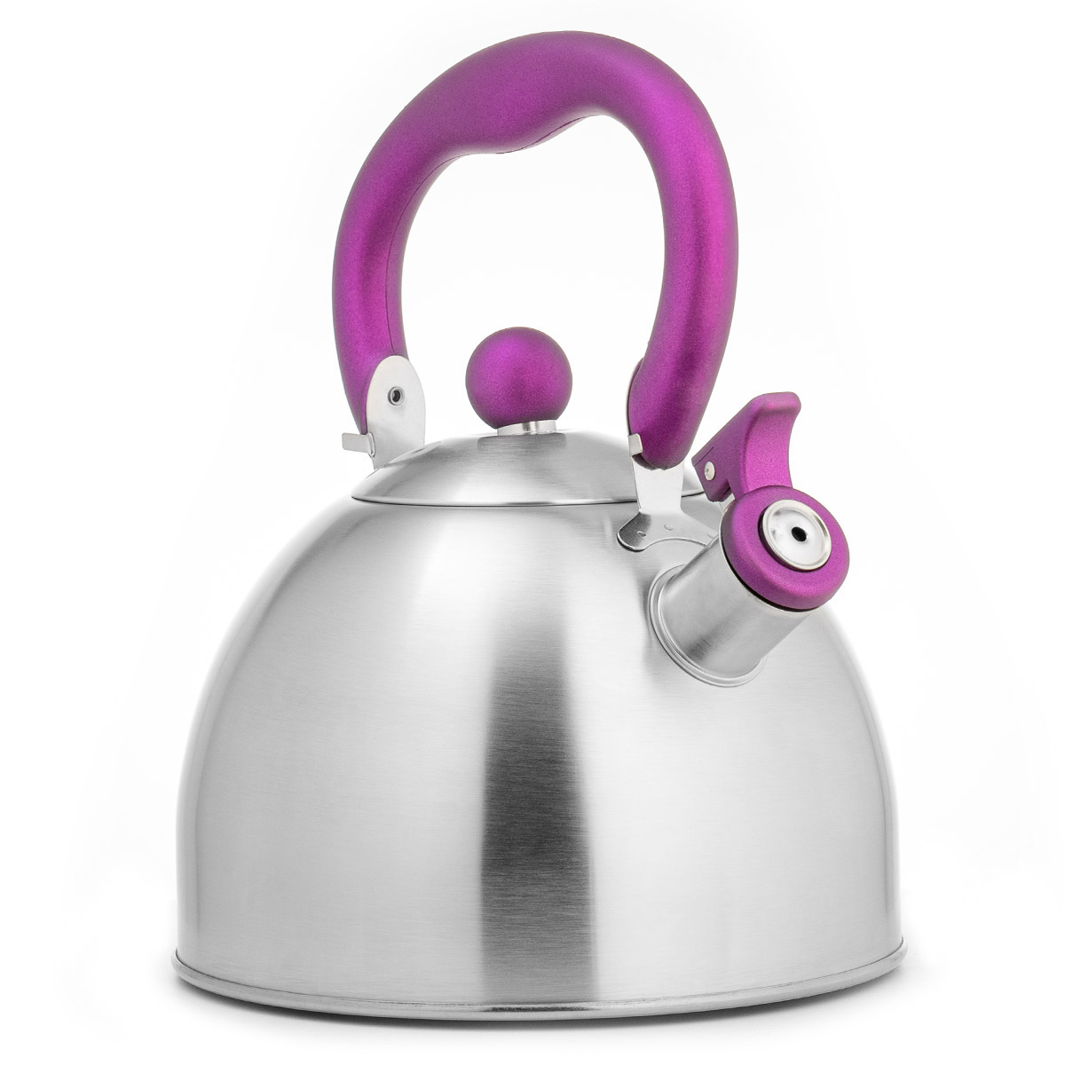 Компактный чайник классической формы LARA со свистком. Матовая полировка корпуса в тандеме с пурпурной отделкой ручек станет ярким акцентом в интерьере вашей кухни. Установленный свисток не позволит пропустить момент закипания воды, и вы вовремя снимите чайник с плиты. Чайник изготовлен из качественной нержавеющей стали. Ручка из ненагревающегося нейлона имеет приятное на ощупь покрытие Soft-touch. Стильная ненагревающаяся крышка с пластиковой ручкой дополняет внешний вид. Свисток на носике открывается с помощью рычага. Индукционное капсулированное дно подходит для всех типов плит.