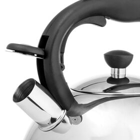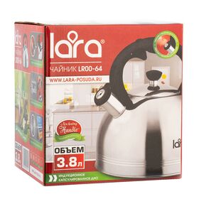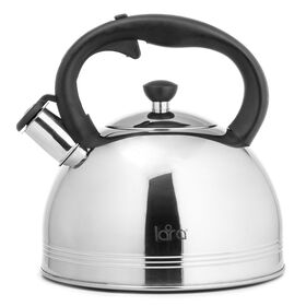 Чайник со свистком LARA в классическом корпусе украшен продольными ребрами у основания. Такой чайник хорошо впишется в интерьер вашей кухни. Он без проблем вскипятит необходимое количество воды, а свисток не позволит пропустить момент закипания. Большой объем и удобная широкая горловина для залива воды. Чайник изготовлен из экологичной высококачественной нержавеющей стали с зеркальной внешней и матовой внутренней полировкой. Эргономичная рукоятка выполнена из ненагревающегося нейлона черного цвета. Установлен свисток с безопасным кнопочным механизмом. Толстое индукционное капсулированное дно подходит для всех типов плит.