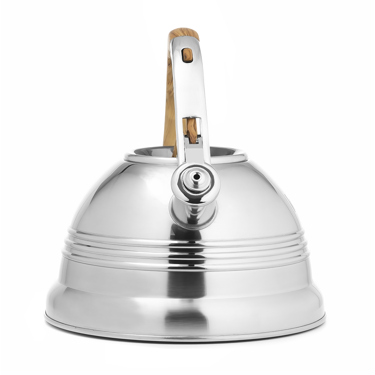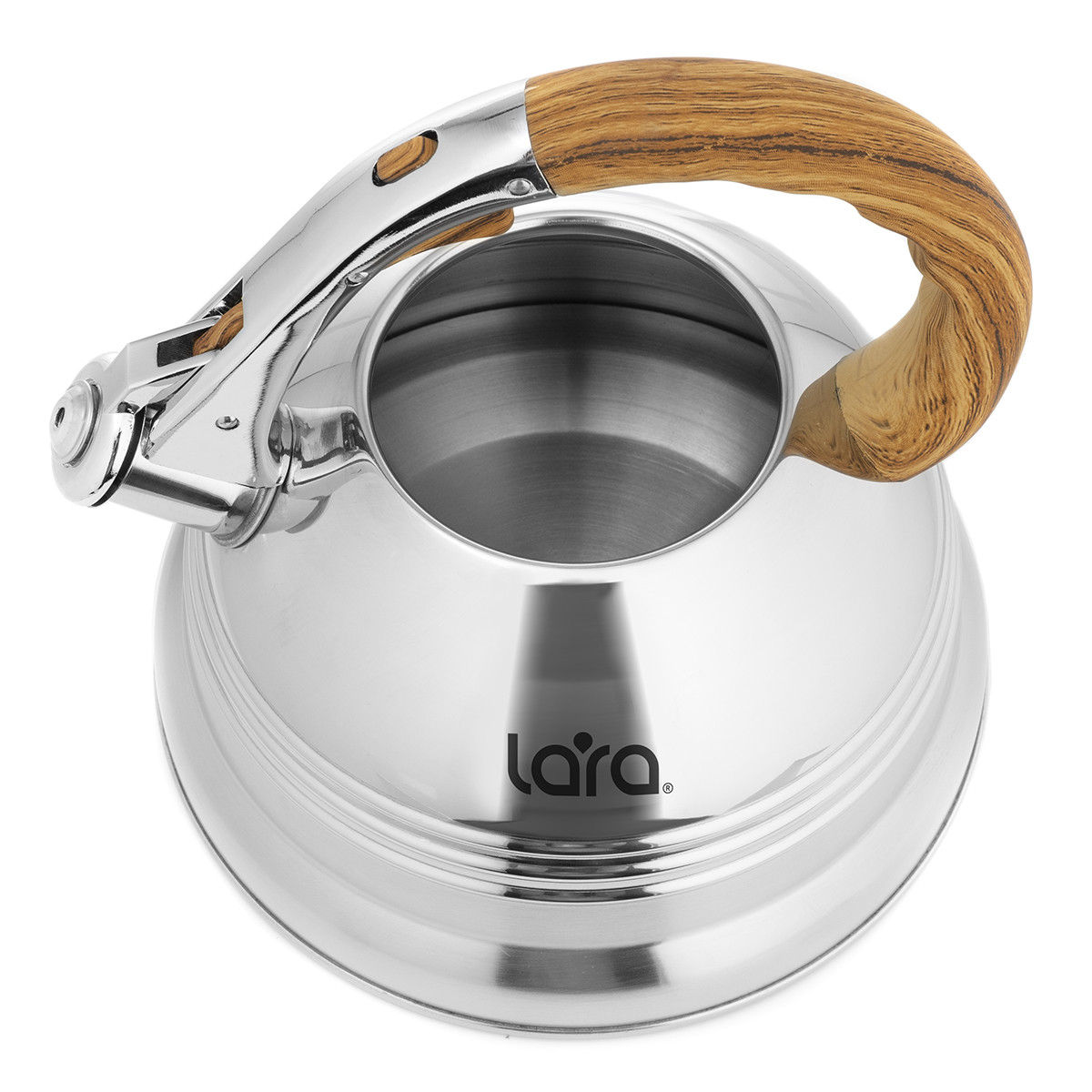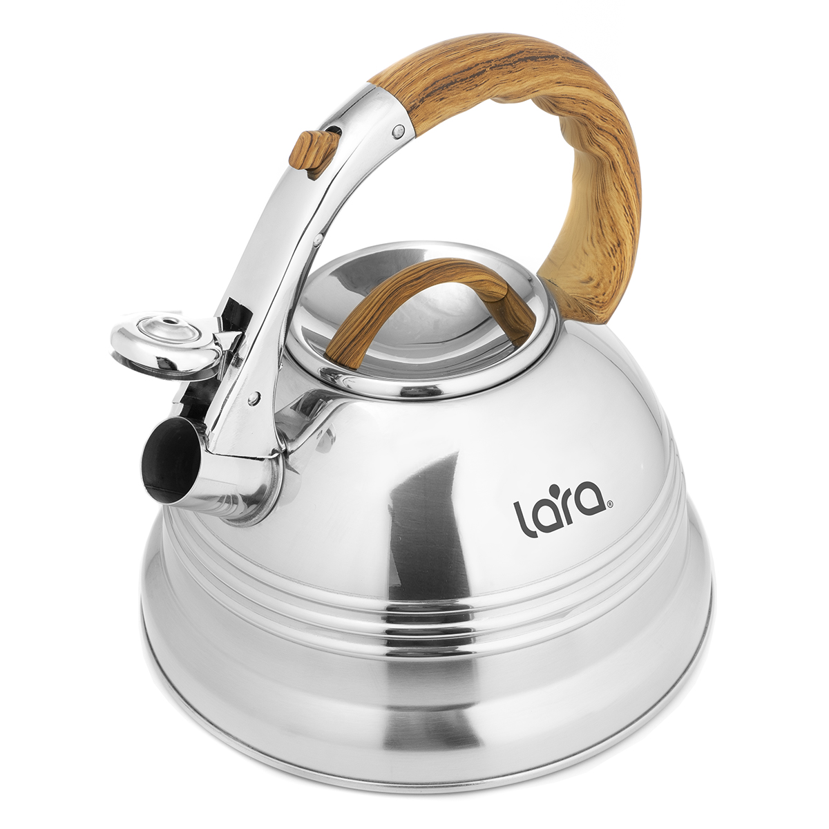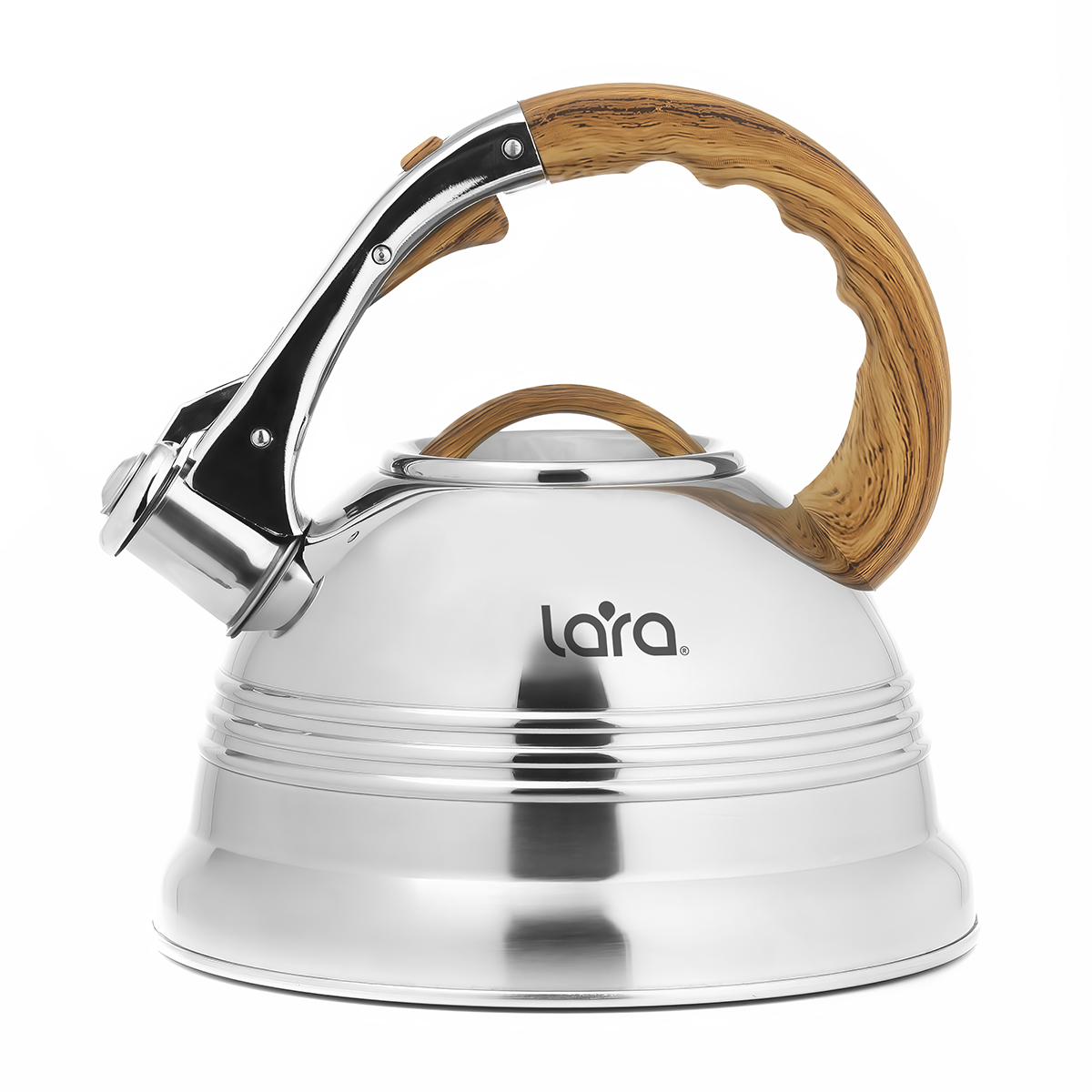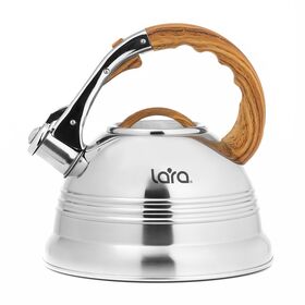Чайник со свистком LARA в классическом корпусе станет прекрасным помощником на вашей кухне. Он без проблем вскипятит необходимый объем воды, а свисток не позволит пропустить момент закипания. Эргономичная ручка с механизмом открывания свистка позволит безопасно использовать его одной рукой. Чайник изготовлен из высококачественной нержавеющей стали с комбинированной матовой и зеркальной отделкой корпуса. Ненагревающиеся пластиковые ручки окрашены под дерево и имеют приятное на ощупь силиконовое покрытие Soft-touch. Толстое индукционное капсулированное дно подходит для использования на всех типах кухонных плит.