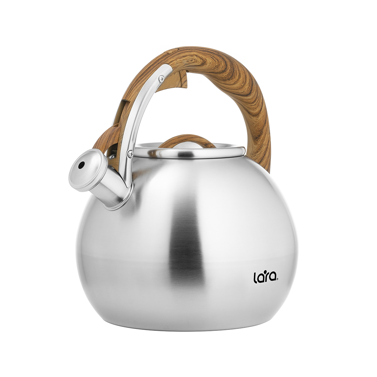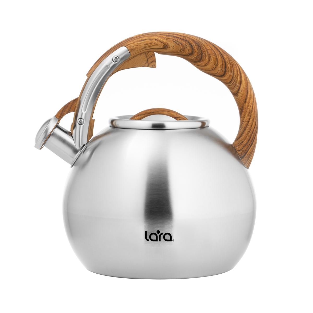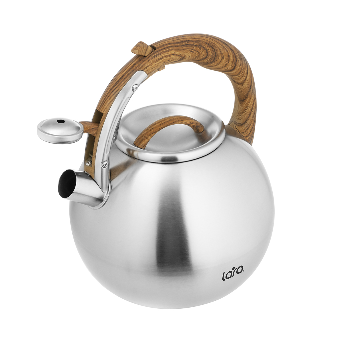 Современный вместительный чайник LARA со свистком станет украшением на вашей кухне. Корпус сферической формы так и норовит обратить на себя внимание. Встроенный свисток не позволит пропустить момент закипания воды, и вы вовремя снимите чайник с плиты. Чайник выполнен из высококачественной нержавеющей стали с матовой отделкой корпуса внутри и снаружи. Оборудован свистком с безопасным кнопочным механизмом. Эргономичная ручка выполнена из ненагревающегося нейлона с имитацией рисунка темной древесины и имеет приятное на ощупь покрытие Soft-touch. Толстое индукционное дно подходит для всех типов плит.