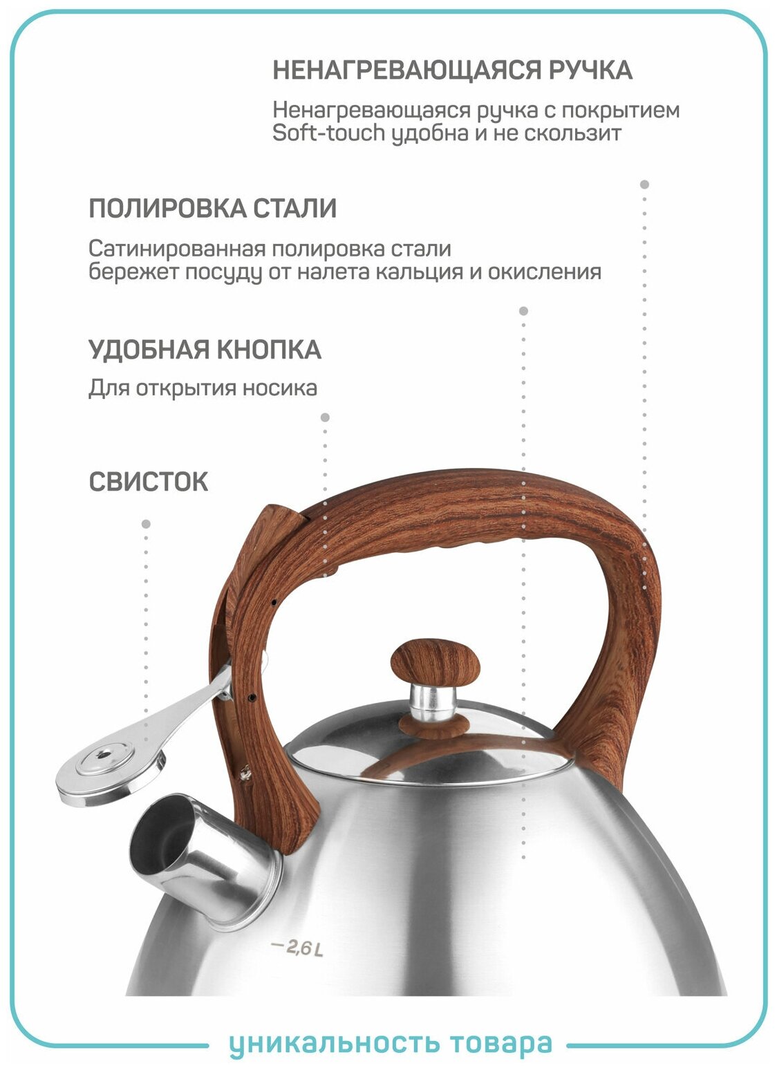 Чайник изготовлен из высококачественной нержавеющей стали марки 18/10 (304), что гарантирует безупречный внешний вид, практичность и долговечность. Эта сталь безопасна для здоровья. Капсулированное дно с алюминиевой вставкой (толщина алюминия 2 мм) обеспечивает быстрое нагревание и равномерное распределение тепла, позволяет воде долго не остывать. Ненагревающаяся ручка с приятным покрытием soft-touch удобна и не скользит.